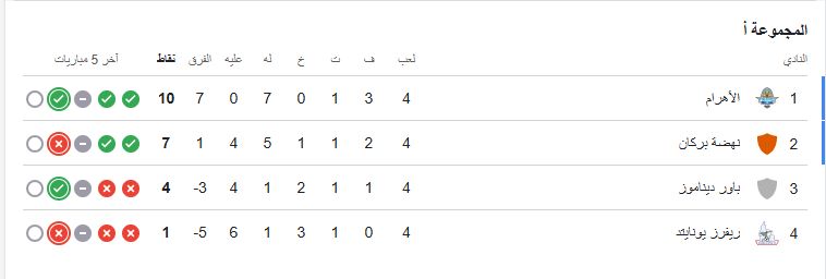 وحسم فريق بيراميدز صدارة المجموعة الأولى بدوري أبطال أفريقيا، وفض الاشتباك مع نهضة بركان المغربي، ويتصدر بيراميدز مجموعته برصيد 10 نقاط، ويليه نهضة بركان المغربي في المركز الثاني برصيد 7 نقاط، ثم باور ديناموز برصيد 4 نقاط في المركز الثالث، ويتذيل ريفرز يونايتد المركز المجموعة في المركز الرابع برصيد نقطة واحدة.