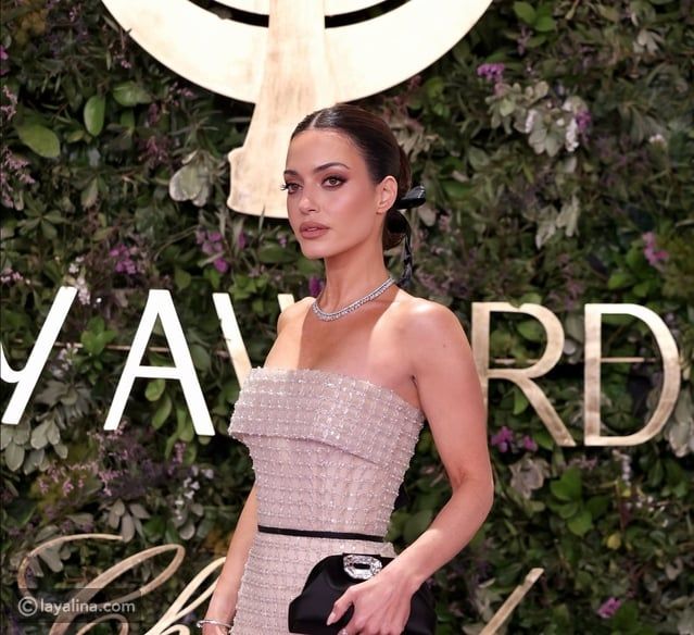اعتمدت كارن وازن على إطلالة ذهبية فاخرة من توقيع المصمم اللبناني نيكولا جبران بتصميم أنثوي راقٍ، تميز بقصة هالتر عند الرقبة مع التفاصيل الناعمة عند الخصر.