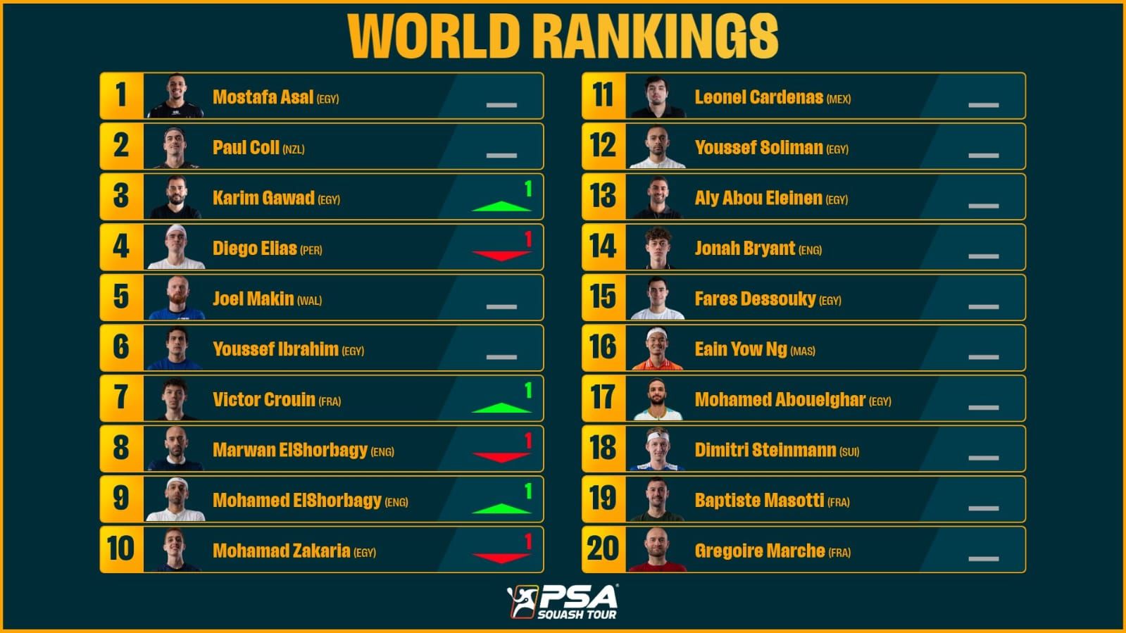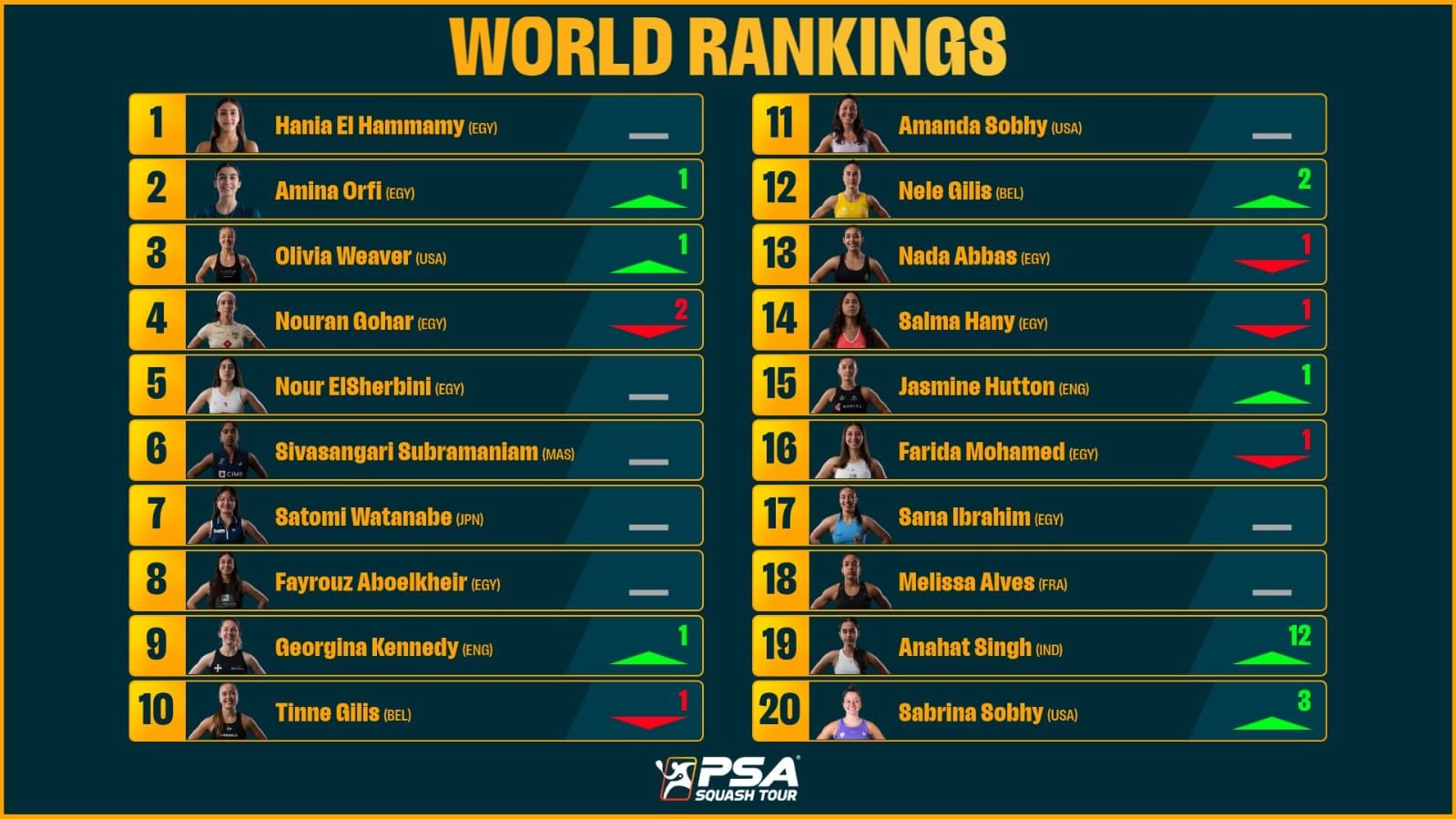 أعلنت رابطة اللاعبين المحترفين للاسكواش التصنيف العالمي الجديد للاعبين واللاعبات خلال شهر فبراير الجاري، وواصل الثنائي المصري مصطفى عسل وهانيا الحمامي تربعهما على عرش تصنيف الرجال والسيدات.