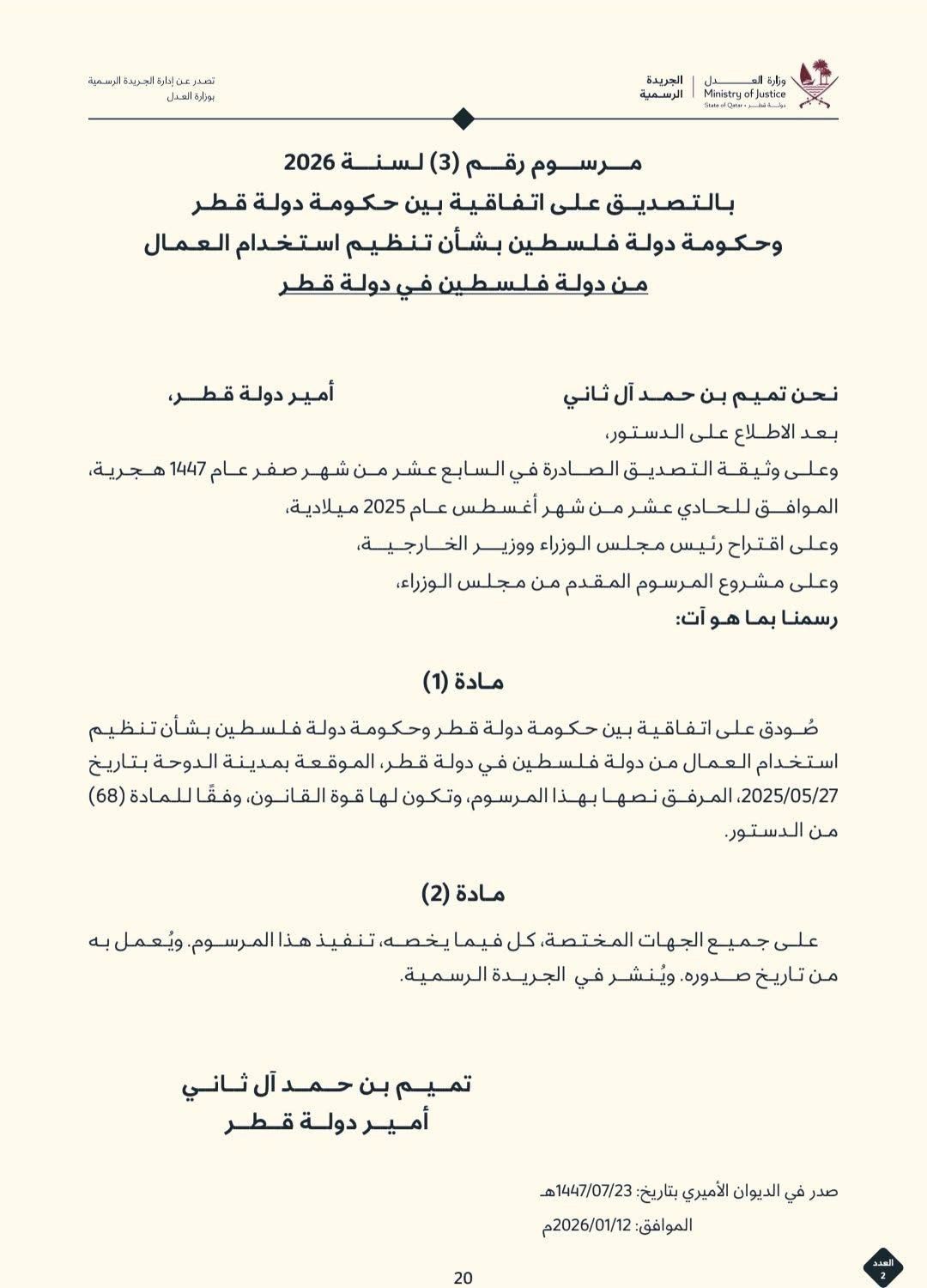 أصدر الشيخ تميم بن حمد آل ثاني، أمير دولة قطر، المرسوم رقم (3) لسنة 2026، بالتصديق على اتفاقية تعاون بين حكومة دولة قطر وحكومة دولة فلسطين، تتعلق بتنظيم استخدام العمال من دولة فلسطين في دولة قطر.