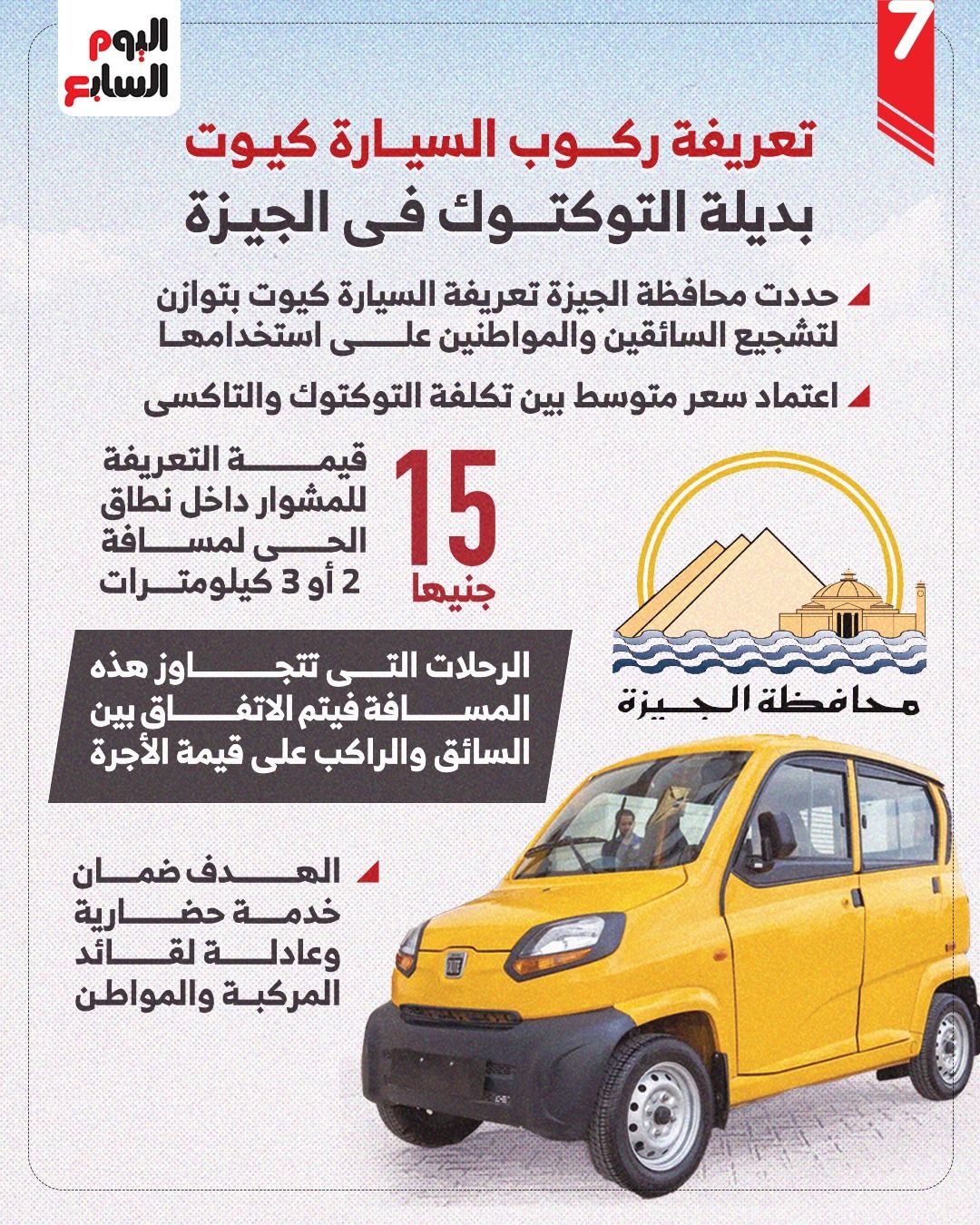 أوضحت محافظة الجيزة، أن التعريفة تم تحديدها بما يحقق التوازن بين تشجيع السائقين وأيضًا تشجيع المواطنين لاستخدام السيارة الجديدة، مشيرًا إلى أنه تم اعتماد سعر متوسط بين تكلفة التوكتوك والتاكسي؛ لتكون أعلى قليلًا من التوكتوك وأقل كثيرًا من التاكسي، بهدف ضمان خدمة حضارية وعادلة لقائد المركبة والمواطن على حد سواء.