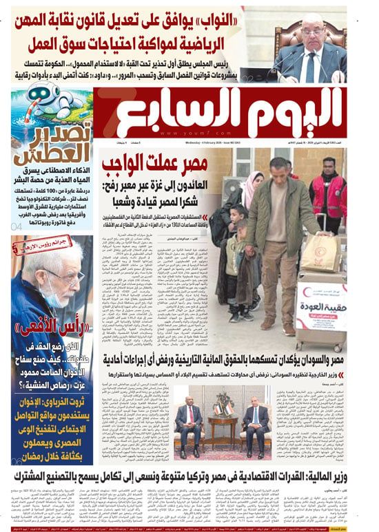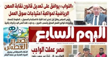 ينشر اليوم السابع في عدده الصادر غدا الأربعاء، تفاصيل هامة حول العديد من الأحداث الجارية على الساحتين الداخلية والخارجية أبرزها ما جاء في الصفحة الأولى تحت عنوان، "النواب" يوافق على تعديل قانون نقابة المهن الرياضية لمواكبة احتياجات سوق العمل، وفيه: رئيس المجلس يطلق أول تحذير تحت القبة «لا لاستخدام المحمول».. الحكومة تتمسك بمشروعات قوانين الفصل السابق وتسحب «المرور».. و«داود»: كنت أتمنى البدء بأدوات رقابية، والتفاصيل تالكاملة في الصفحة الثانية من العدد الورقى.