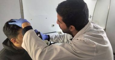 اجراء الكشق الطبي على طفل بالقافلة المجانية