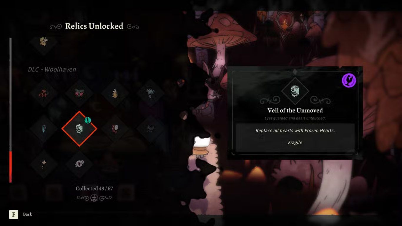 عند استخدام عنصر Rotten Eye Of The Witness للمرة الثانية داخل لعبة Cult Of The Lamb Woolhaven DLC يتم فتح Relic جديد يحمل اسم Veil Of The Unmoved ويعد هذا العنصر امتدادا مباشرا لفكرة تغيير طبيعة القلوب وتأثير الضرر أثناء القتال. يقدم هذا الـ Relic أسلوب لعب مختلف يعتمد على التحكم في إيقاع المواجهات بدلا من التركيز على الضرر المباشر فقط.