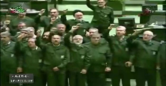 وثق مقطع فيديو لحظة ارتداء عدد من نواب البرلمان الإيراني زي الحرس الثوري، داخل قبة المجلس، ورددوا هتافات مناهضة لأمريكا وإسرائيل.