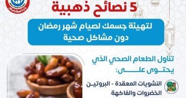 غذاء صحى ومتوازنوأكدت الوزارة أهمية الاعتماد على نظام غذائي صحي يحتوي على النشويات المعقدة والبروتين، إلى جانب الخضروات والفاكهة، لما لها من دور في إمداد الجسم بالطاقة والعناصر الغذائية اللازمة، والمساعدة على الشعور بالشبع لفترات أطول أثناء الصيام.