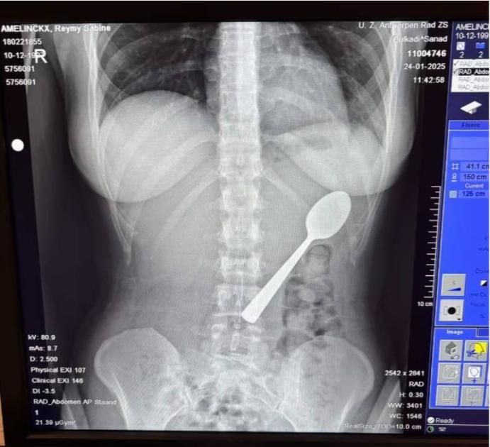 خضعت البلجيكية ريمي أميلينكس، 28 عاماً، لعملية صغيرة لإخراج ملعقة طولها 17 سنتيمتراً ابتلعتها عن طريق الخطأ، بعد أن قفز كلبها عليها بشكل مفاجئ أثناء تناولها الزبادي.