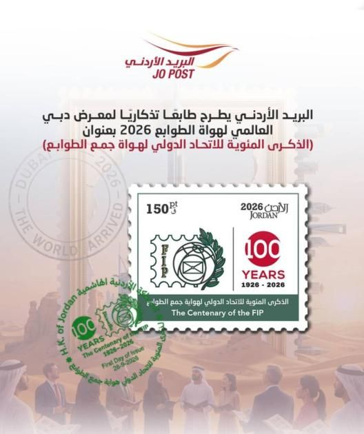طرح البريد الأردني، طابعاً تذكارياً خاصاً، احتفاء بمعرض دبي العالمي لهواة الطوابع 2026 الذي يقام من 4 إلى 8 فبراير الجاري ويحظى بمشاركة دولية واسعة.