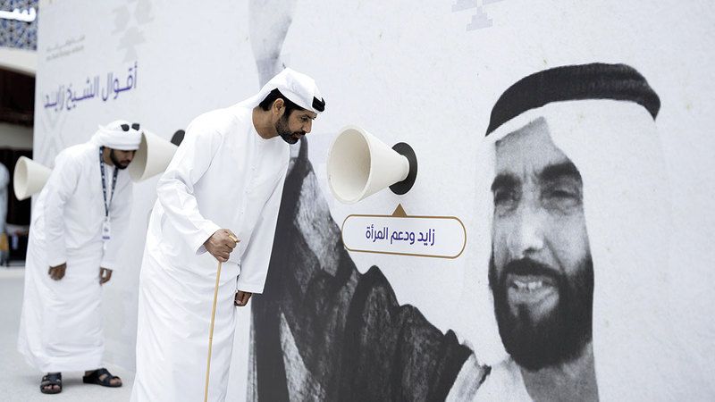 بصور المغفور له الشيخ زايد بن سلطان آل نهيان، طيّب الله ثراه، بابتسامته التي تجمع الهيبة والود، يتزين أحد الجدران في ساحة مهرجان العين التراثي، ليمثل بوابة لزوار المهرجان الذي يستمر حتى التاسع من الشهر الجاري بأرض المعارض في مدينة العين، يعبرون منها لرحلة إنسانية فريدة، يقتربون فيها من صوت المؤسس، وفكره، ورؤيته التي شكّلت ملامح الوطن.