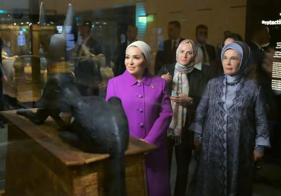 وخلال الزيارة تلقت أمينة أردوغان من انتصار السيسي معلومات حول المتحف، وتم التقاط الصور التذكارية لهما أمام عدد من الآثار المصرية الفرعونية القديمة.
