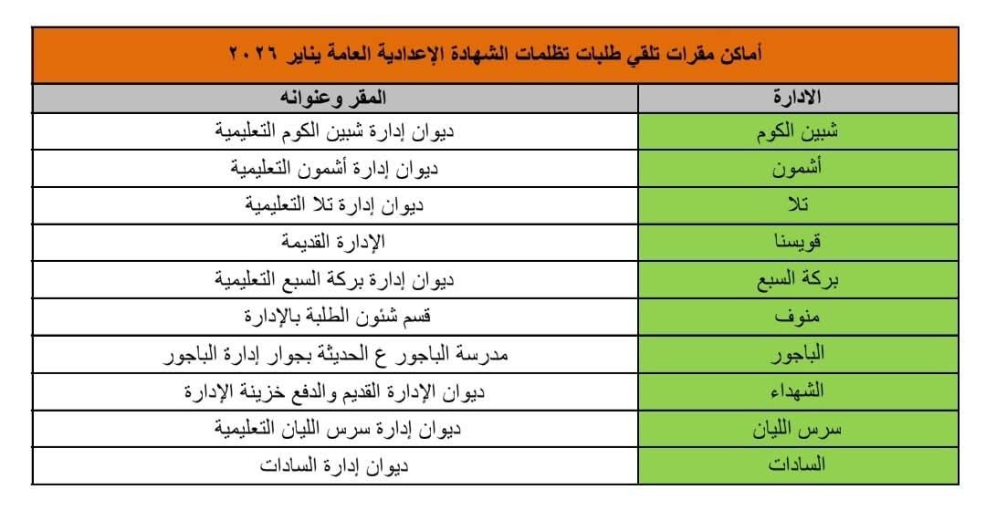 واشار وكيل الوزارة، إن أماكن مقرات تلقي طلبات التظلمات بكل إدارة حسب الجدول المرفق على مستوى المحافظة.