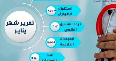 أرقام دعم وعلاج المواطنين داخل مجمع الأقصر الطبي الدولى خلال 30 يوماًوفى هذا الصدد كشف تقرير شهر يناير داخل مجمع الأقصر الطبي الدولى، عن استقبال قسم الطوارئ لـ18763 حالة، وبلغ عدد مرضى الدخول للمجمع 1292 مريض، وكذلك تم إجراء داخل المجمع سلسلة من العمليات الجراحية شملت 980 عملية متنوعة للمواطنين، وتم تقديم الخدمات الطبية والدعم لـ18554 مواطن في العيادات الخارجية بالمجمع، وبلغت أعداد المترددين بقسم الغسيل الكلوى 1602 حالة.