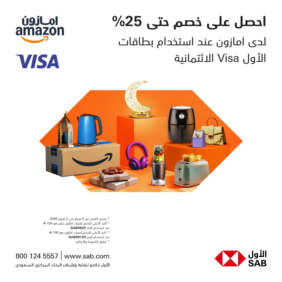 البنك الاول SNB خصم حتى 25% لدى أمازون 5 فبراير 2026 نقدم لكم افضل العروض الخاصة من البنك الاول استفيدوا من الخصم الذي ينتهي اليوم الخميس 5 فبراير 2026 ولا تفوتوا خصم يصل حتى 25% عند استخدام بطاقات الأول Visa الائتمانية.