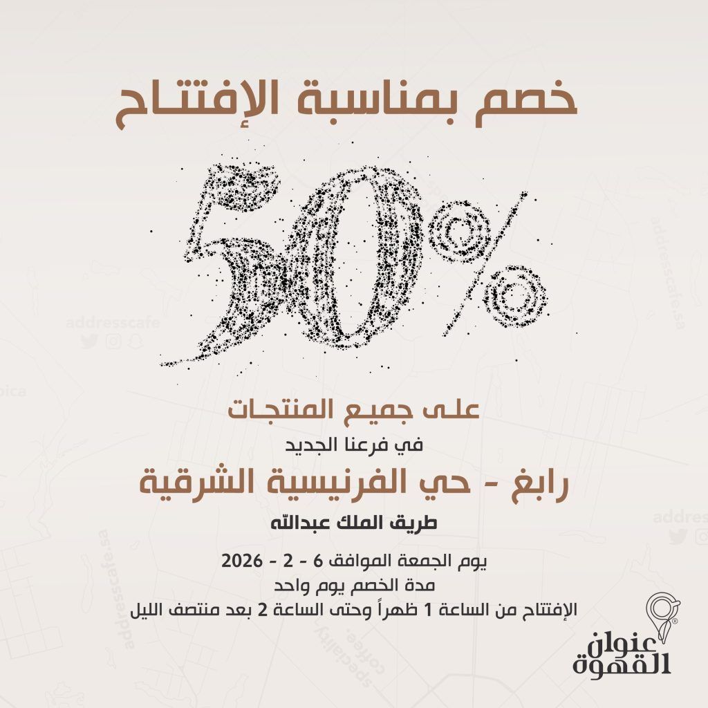 عروض افتتاح فروعنا الجديدة في عنوان القهوه الجمعة 6 فبراير 2026 الفرع الاول في رابغ – حي الفرنيسية طريق الملك عبدالله و الفرع الثاني بريدة – حي النازية طريق الملك عبدالله مع خصم 50% على جميع المنتجات لا تفوتوا الاحتفال معنا.