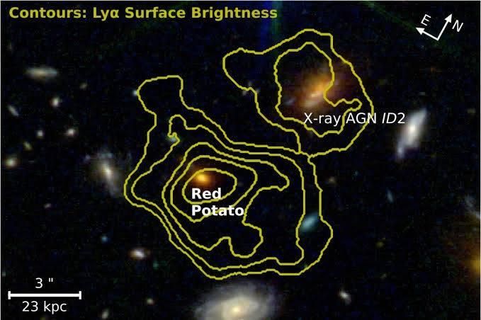 وخلال عمليات الرصد باستخدام كاميرا الأشعة تحت الحمراء القريبة ومطياف الأشعة تحت الحمراء القريبة على متن تلسكوب جيمس ويب، اكتشف الفريق بالصدفة مجرة حمراء ضخمة ذات شكل غير معتاد، ما دفعهم إلى تسميتها «البطاطس الحمراء».