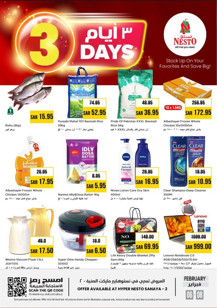 عروض 3 أيام من التوفير في نستو سنايا الرياض من 6 إلى 8 فبراير 2026 صفقات مليئة بالقيمة و اسعار منافسة على مقاضي المنزل الاساسيه في اسواق نستو هايبر ماركت الرياض فرع سنايا استفيدوا من التخفيضات الحصرية