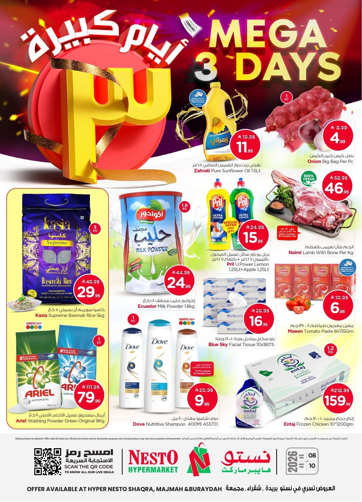 كما تضمنت عروض نستو القصيم هذا الاسبوع المجمدات والخضروات المشكلة والبيتزا والجبنة الموزاريلا المفرومة و ايضا منتجات العناية الشخصية والمنظفات الي جانب مساحيق غسيل الملابس ومنظفات المراحيض ومناديل الأطفال