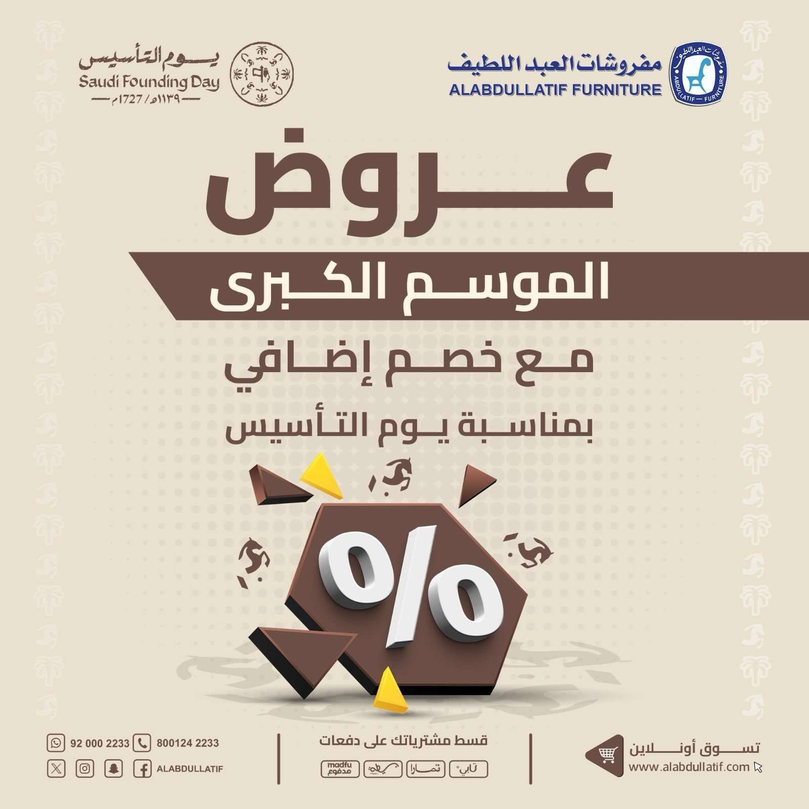عروض مفروشات العبداللطيف بمناسبة يوم التأسيس 7 فبراير 2026 منتجات متنوعة بأقوى الاسعار عروض الموسم الكبرى أحدث وأجود أنواع الأثاث المنزلي والأثاث المكتبي والسجاد الفاخر تسوق أون لاين من الموقع الالكتروني.
