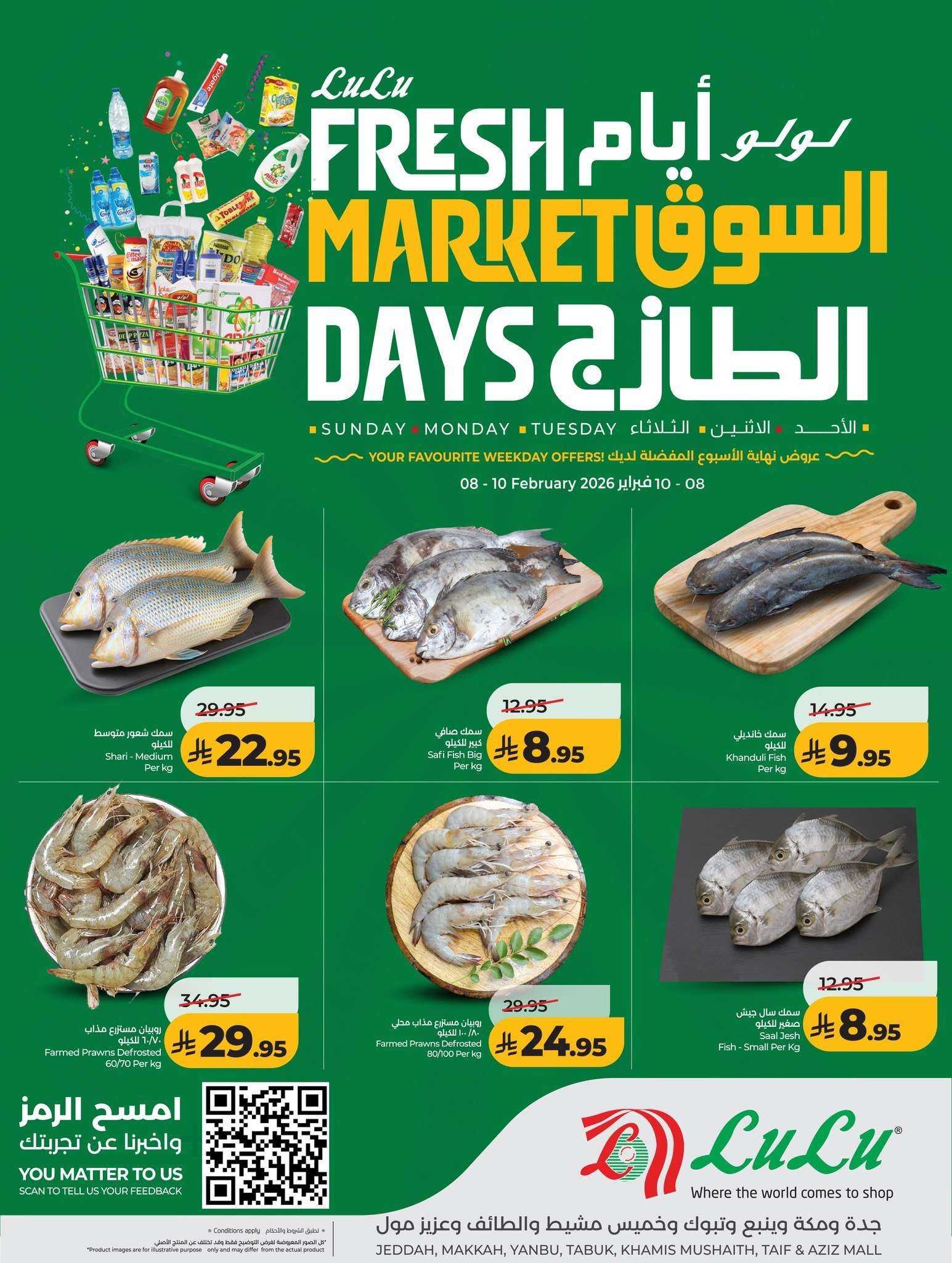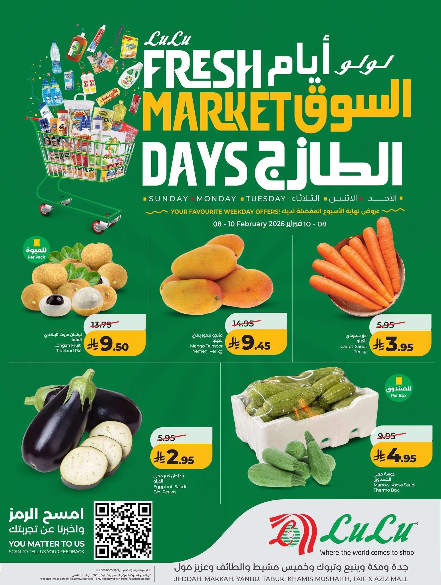 نقدم لكم عروض لولو جدة الاحد 8-2-2026 – 20 شعبان 1447هـ و تحتوي علي الفواكه منها مانجو تيمور يمني وفاكهة اللونجان وجزر سعودي وباذنجان كما يشمل الأسماك سمك باراموندي ودنيس وشعور وصافي وخانديلي وسال جيش