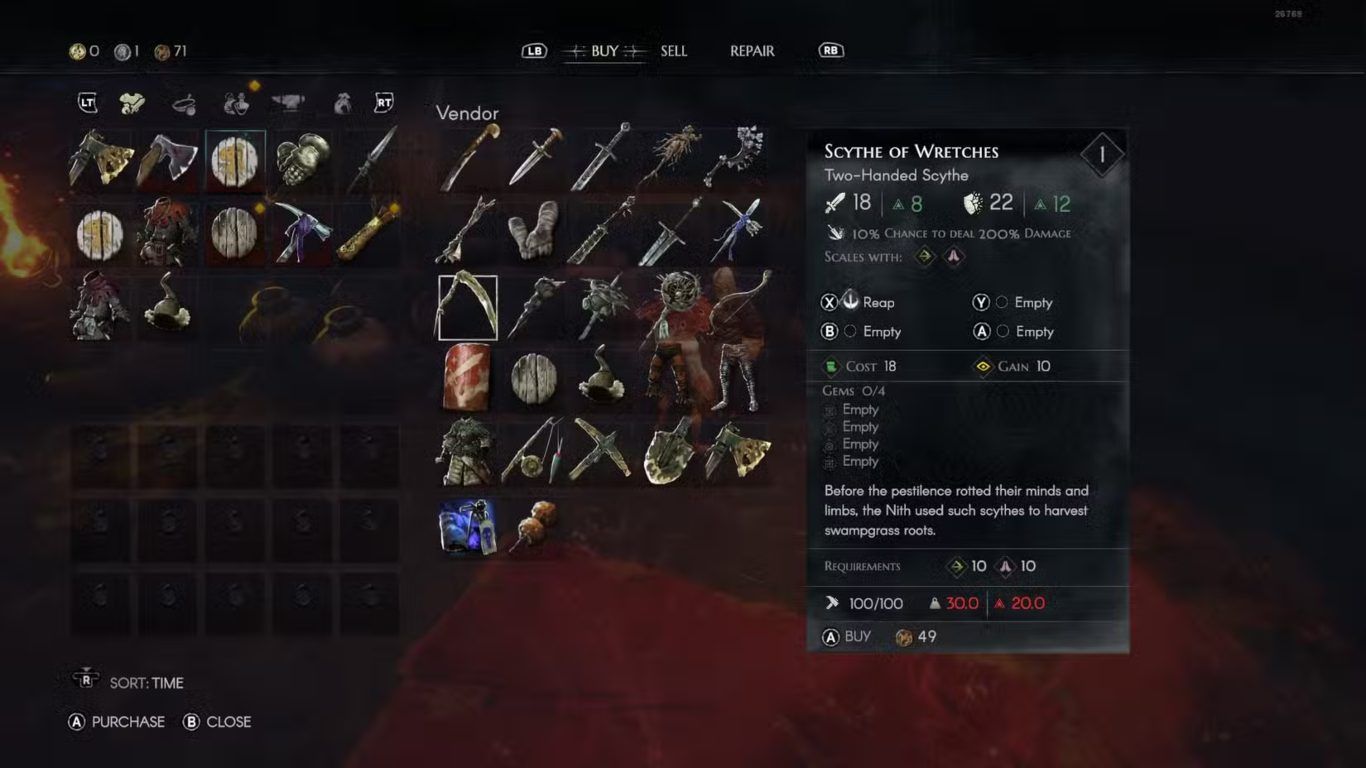أما Scythe فيمنح اللاعب نطاق حركة أوسع وقدرة أفضل على التحكم في الحشود بفضل الضربات القافزة والواسعة التي تسمح بإصابة الأعداء من زوايا متعددة مع الحفاظ على مسافة آمنة نسبيا.
