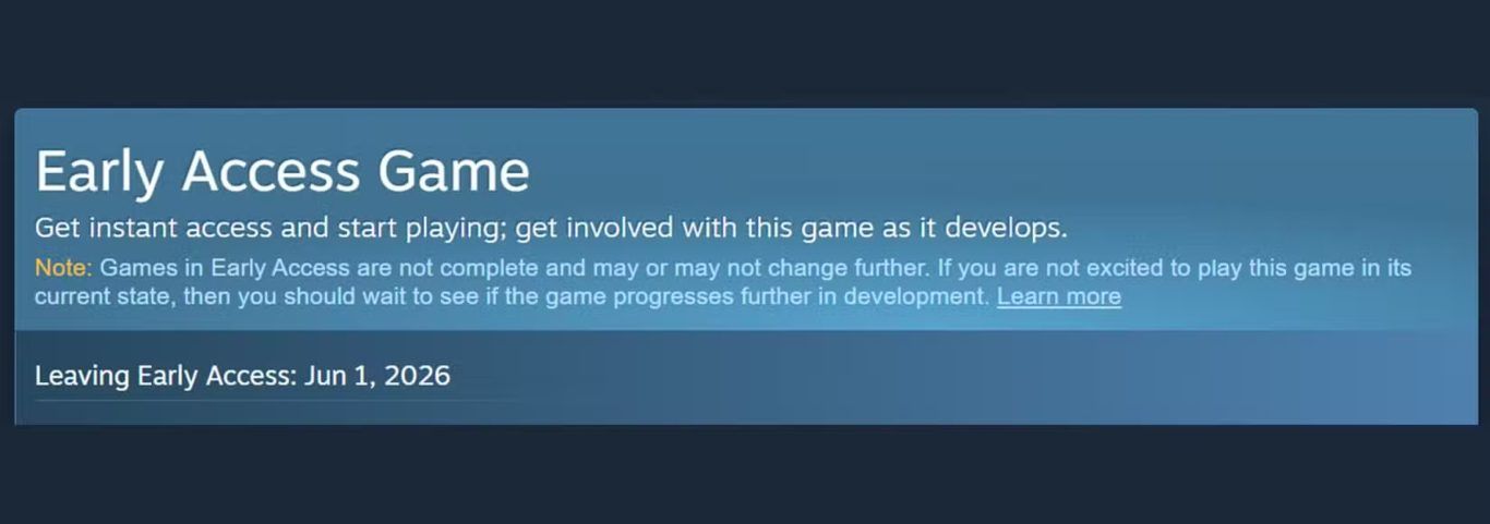 يتم تمييز موعد الإصدار الكامل بوسم واضح يحمل عبارة Leaving Early Access مما يجعل حالة اللعبة المستقبلية مفهومة بسهولة دون الحاجة إلى البحث داخل وصف طويل أو تحديثات منفصلة.