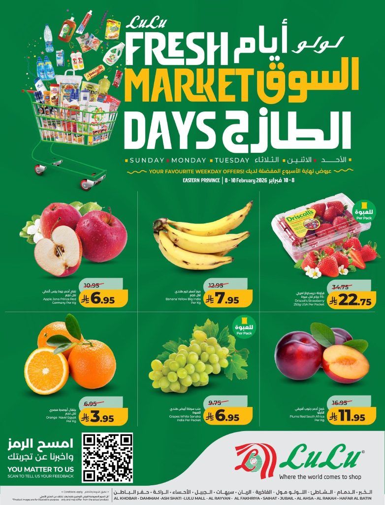 عروض لولو الدمام الطازج الاحد 8 فبراير 2026 الموافق 20 شعبان 1447هـ وتحتوي علي سمك شعري وكنمان وباراكودا وروبيان طازج ومحلي وشمام وبطاطا حلوة وفطر وبصل وبطاطس بالإضافة إلى مكعبات لحم جاموس وجمل ولحم غنم نعيمي وبقري محلي ودجاج الوطنية الطازج باقل الاسعار المناسبة للجميع