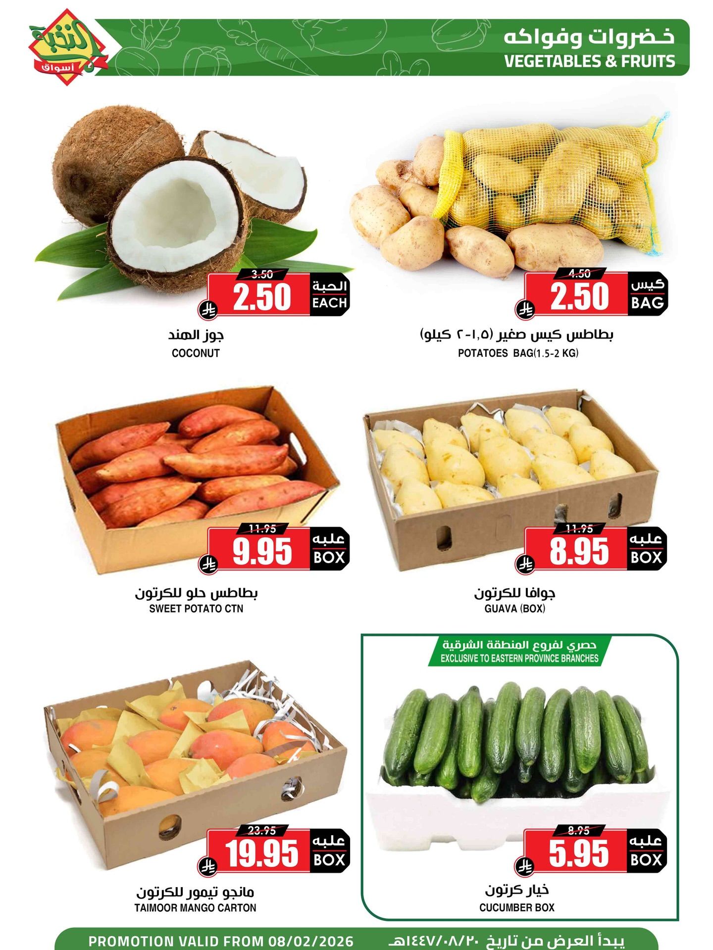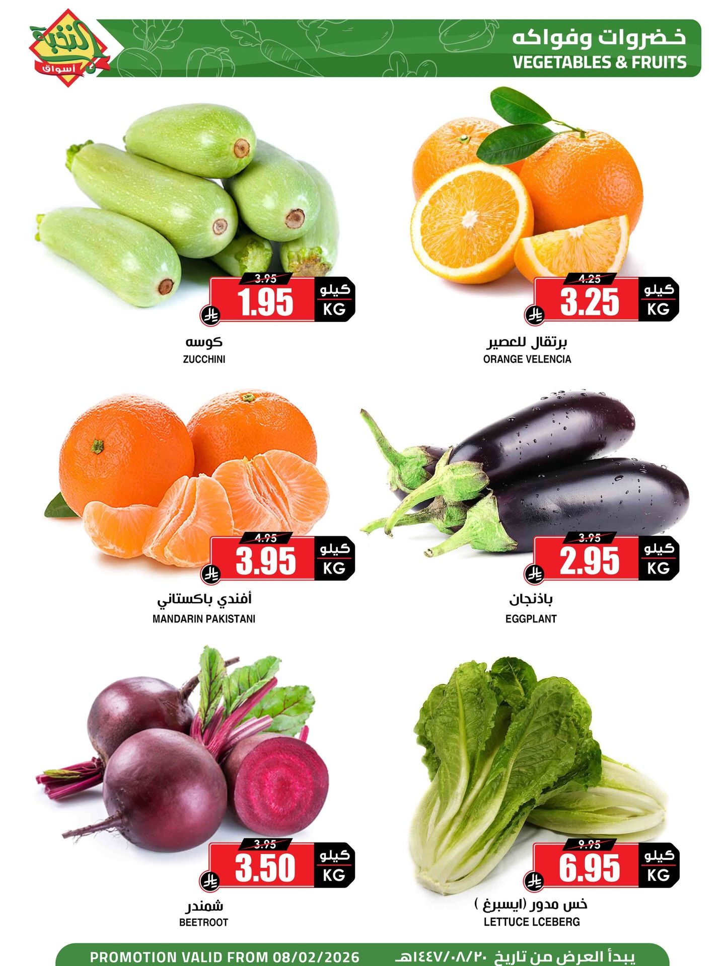 عروض اسواق النخبة الاحد 20 شعبان 1447هـ الموافق 8-2-2026 و تحتوي علي شكيلة متنوعة تشمل الكوسة والباذنجان والشمندر والبطاطس والذرة والخيار