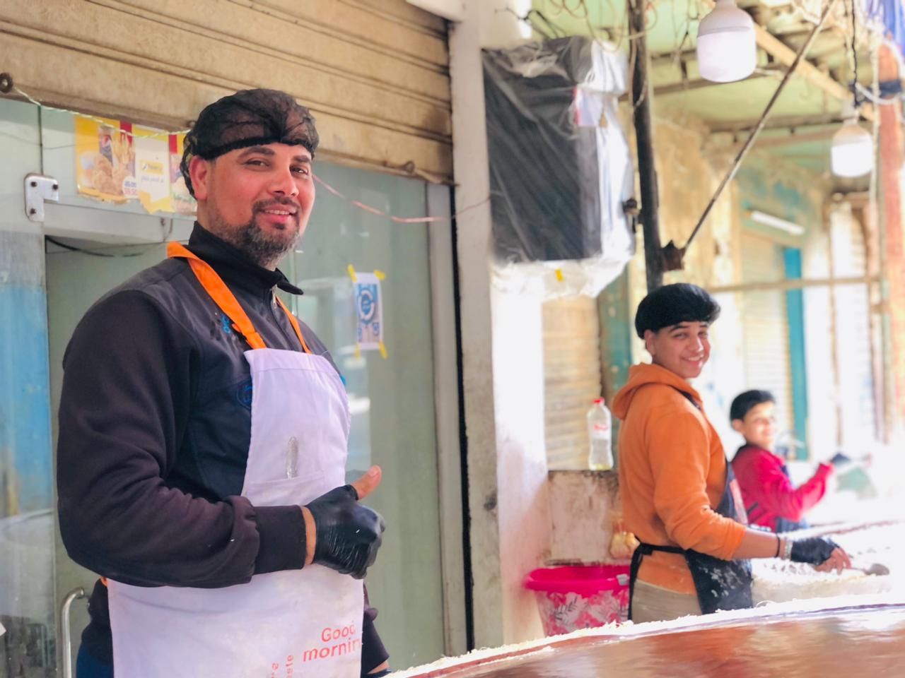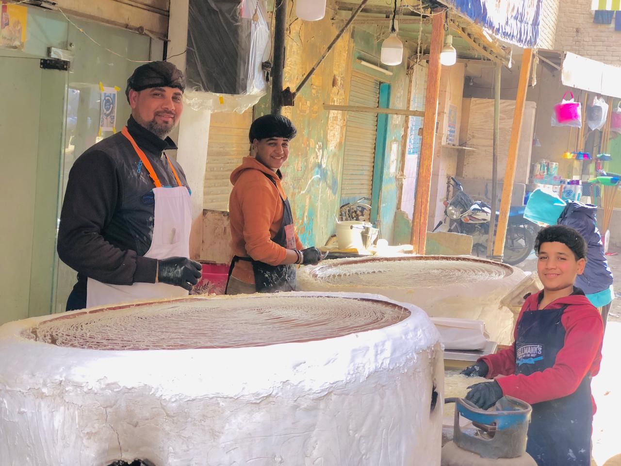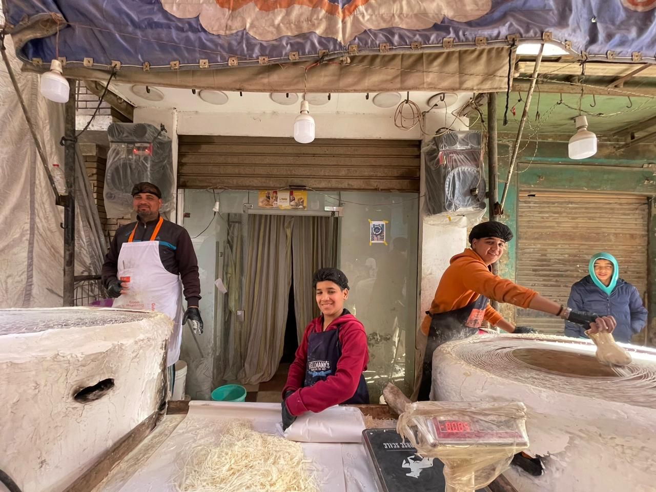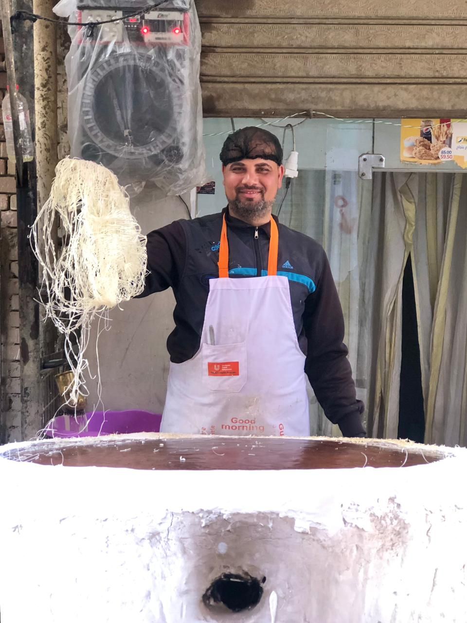 أمام هذا الفرن يقف هاني محمد، كعادته، يتعامل مع التفاصيل بعين الخبير ويد الصانع، يمسك الكوز ويُوزّع عجين الكنافة على صينية الفرن بحركة دقيقة، فتنساب الخيوط الرفيعة متتابعة ومتساوية، كأنها تُنسج على النار نسجًا.