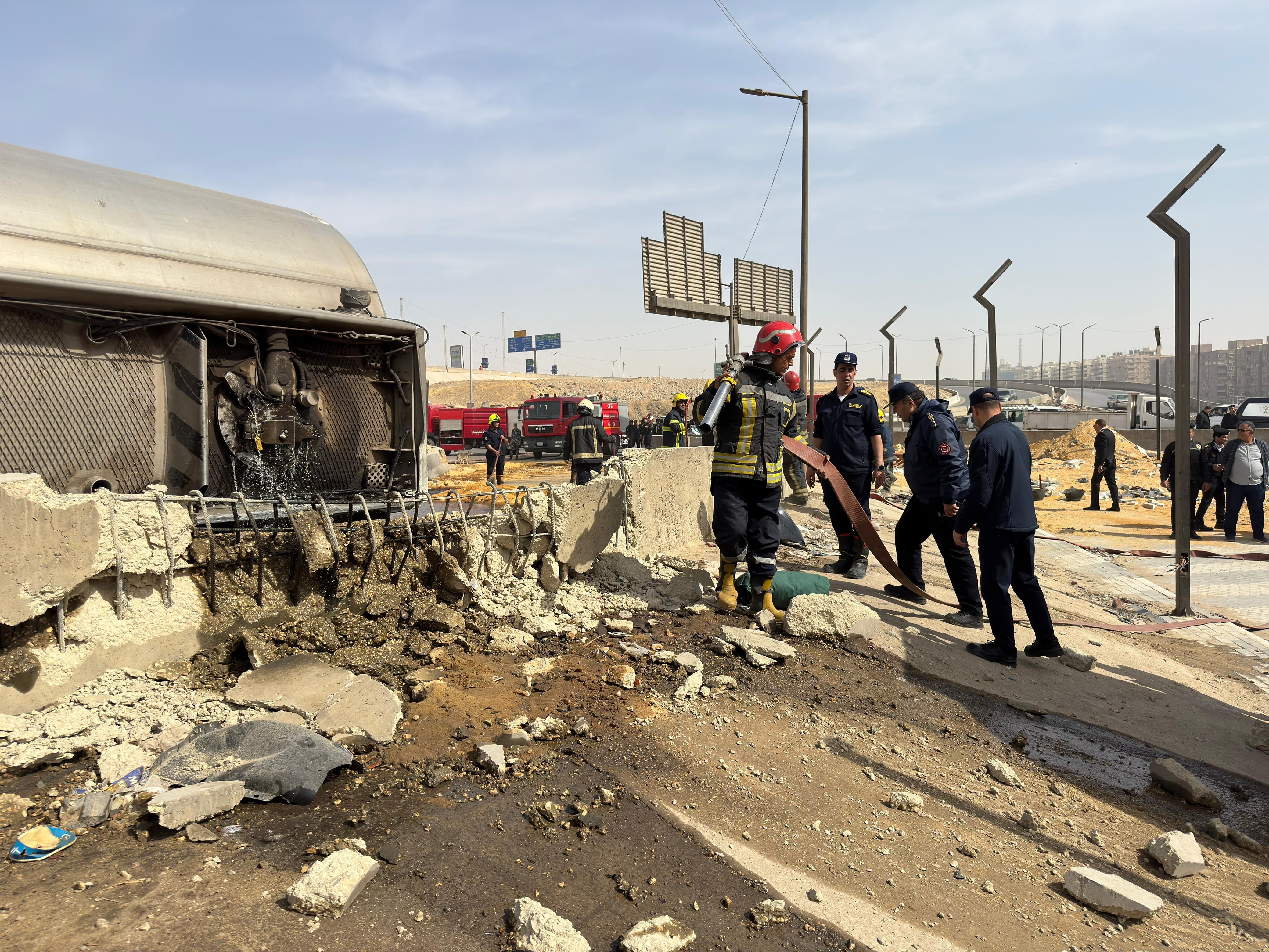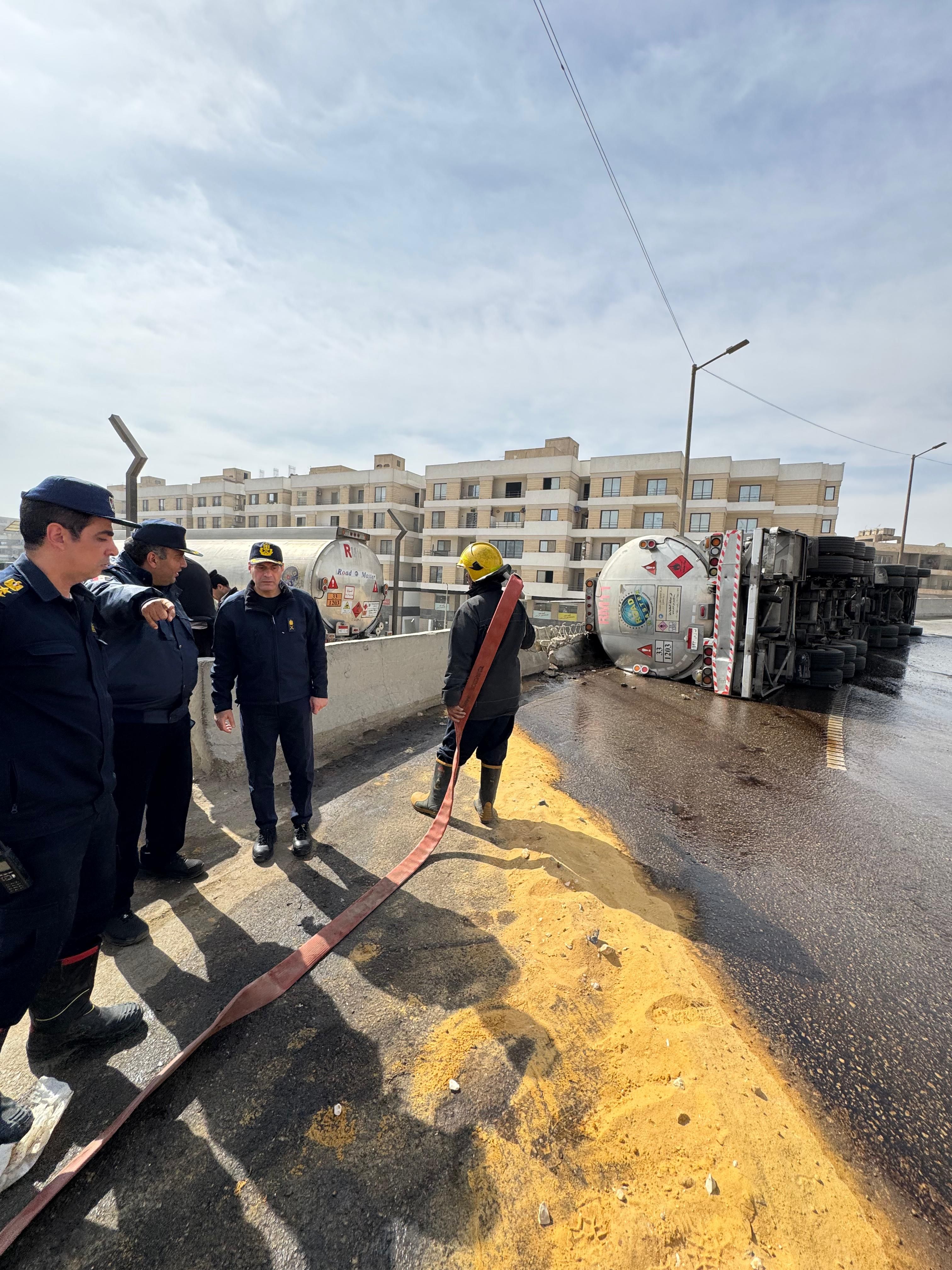 كما قال رجال الحماية المدنية بعمل مسارات بالرمال لصرف المادة البترولية بالظهير الصحراوي على جانب الكوبري كما وصلت سيارة نقل مواد بترولية أخرى تحمل لوحات معدنية أرقام (ط أ ج ٥٤٣ - س ر د ٤٥٣) ، و ذلك لسحب المادة البترولية من السيارة المقلوبة للعمل على إعادة المكان لطبيعته مرة أخرى وتم اتخاذ الإجراءات القانونية اللازمة تجاه الواقعة.
