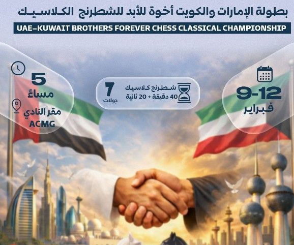 أعلن نادي العين للشطرنج والألعاب الذهنية، تفاصيل بطولة "الإمارات والكويت – إخوة للأبد" للشطرنج الكلاسيكي التي تقام خلال الفترة من 9 إلى 12 فبراير الجاري بمقره في منطقة العين، بمشاركة نخبة من اللاعبين الدوليين يتنافسون للفوز بالمراكز الأولى، بنظام 7 جولات.