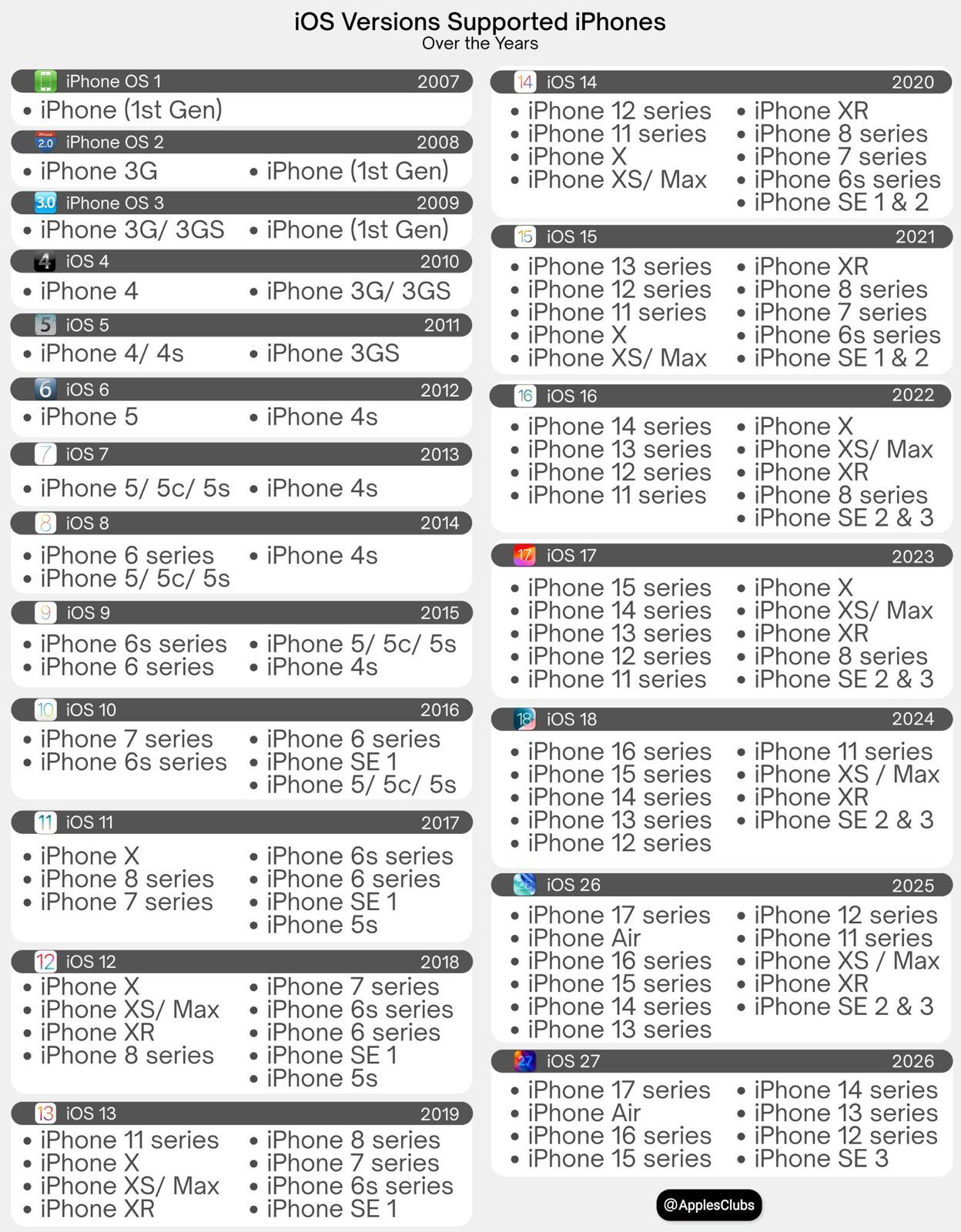 ويستعرض المخطط، الذي نُشر عبر حساب Apple Club، جميع إصدارات iOS منذ ظهور iPhone OS 1 عام 2007 وحتى الإصدارات المتوقعة في عام 2026، مع توضيح كل أجهزة آيفون التي حصلت على التحديثات عبر السنين.