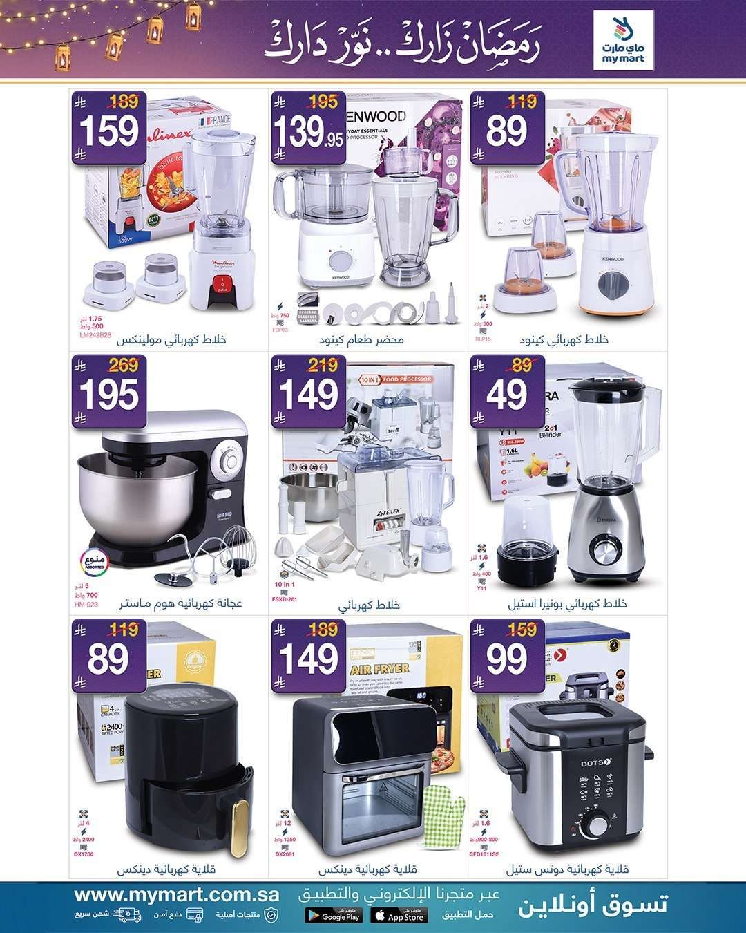 عروض ماي مارت الاسبوعية الاثنين 9 فبراير 2026 الموافق 21-8-1447هـ و تحتوي علي تشمل محضرة طعام وخلاط كهربائي وعجانة وعصارة و مفرمة وخلاط يدوي وقلاية هوائية وقلاية زيت وميكروويف وفرن كهربائي ومكنسة كهربائية وصواني تسخين سيراميك وأكواب بلاستيكية و غيرها من المنتجات و باسعار مميزة في عروض رمضان 2026