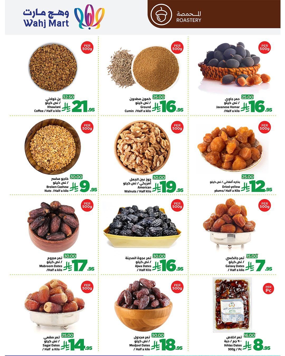 و تشمل ايضا عروض وهج مارت بن وكمون وكاجو وجوز وفواكه مجففة وتشكيلة فاخرة من التمور مثل العجوة والمجدول كما تشمل لحوما طازجة من مفروم وستيك وكبدة عجل ومنتجات الألبان