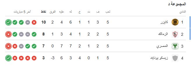 تقدم كايزر تشيفز الجنوب أفريقي للمركز الأول فى صدارة المجموعة برصيد 10 نقاط، بينما تجمد رصيد فريق الزمالك فى المركز الثاني عند 8 نقاط، وتراجع المصري للمركز الثالث برصيد 7 نقاط، ويأتي زيسكو يونايتد الزامبي في المركز الرابع والأخير برصيد 3 نقاط.
