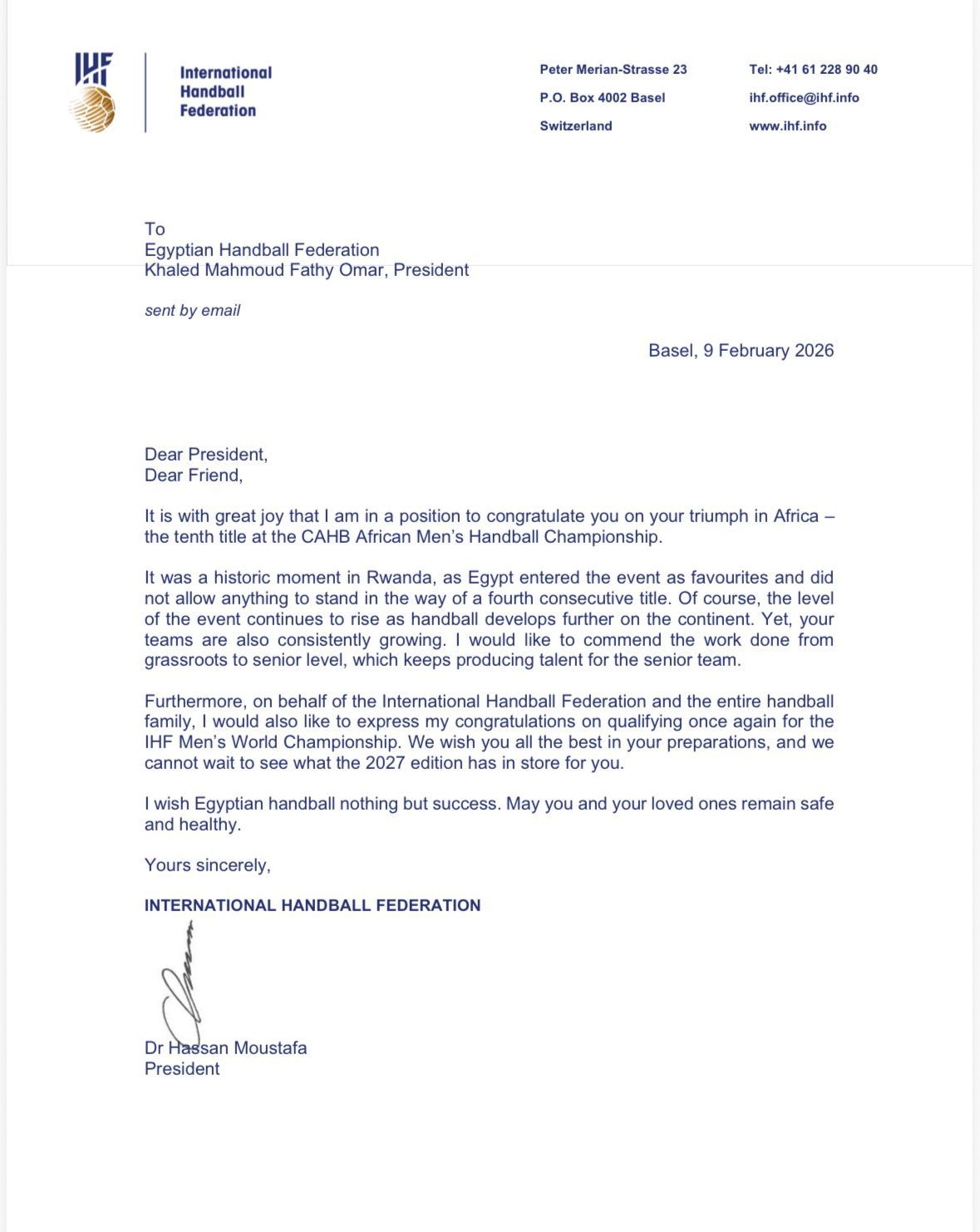 واختتم الخطاب بتمنيات الاتحاد الدولي لكرة اليد بمزيد من النجاحات لكرة اليد المصرية، مع أطيب الأمنيات بالصحة والسلامة لجميع أفراد المنظومة.