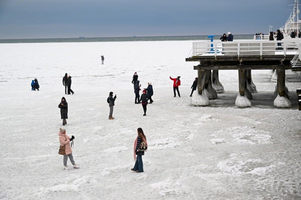 توافد الزوار على بحر البلطيق المغطى بالجليد في سوبوت