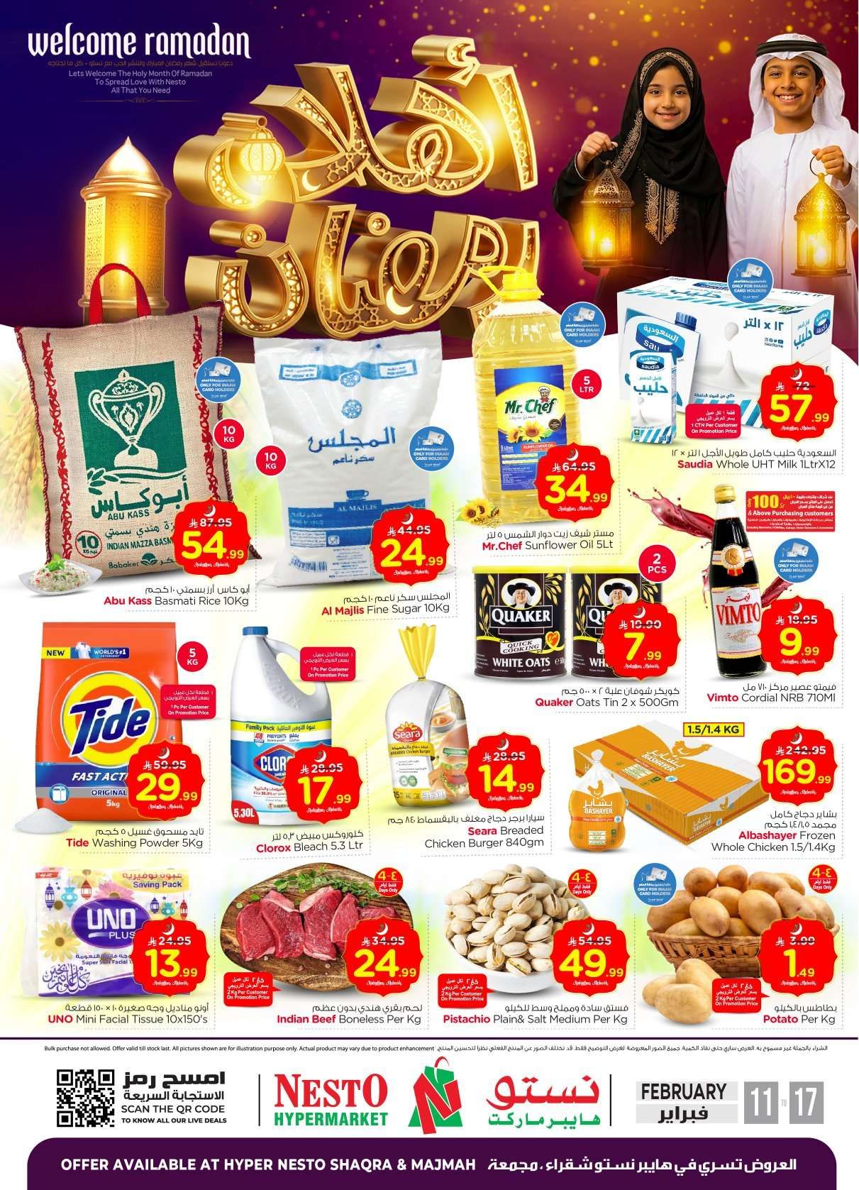 عروض نستو القصيم الأربعاء 11-2-2026 الموافق 23 شعبان 1447 تنفرد بتقديم سمك البوري والقهوة الهررية والهيل والزعفران وأرز بنجاب واللبن الرائب وقشطة المائدة والمربى والزيتون وصدور دجاج