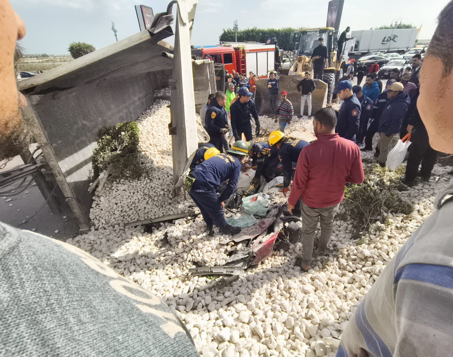 مصرع شخصين فى انقلاب تريلا على سيارة ملاكى بالإسكندرية.. صور