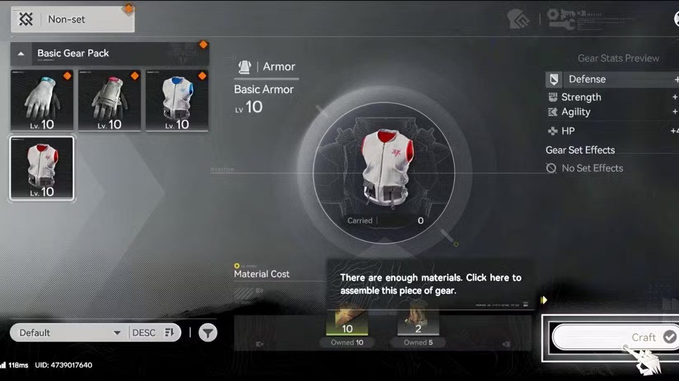 يقوم اللاعب باختيار Gear Recipe المناسبة من القائمة ثم الضغط على خيار Craft لبدء عملية التصنيع وتحويل الموارد المتوفرة إلى قطعة Gear جاهزة للاستخدام من قبل Operators.