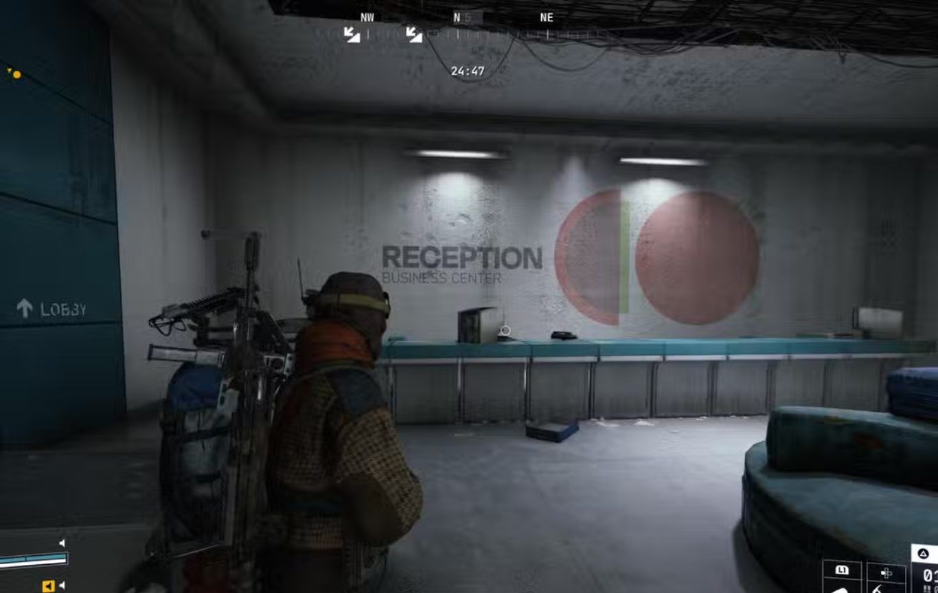 يتطلب الوصول إلى منطقة الاستقبال التنقل بحذر داخل المبنى نظرا لاحتمالية تواجد raiders آخرين في الممرات القريبة من المدخل مما يجعل الانتباه للمحيط أمرا ضروريا قبل التقدم نحو الهدف.