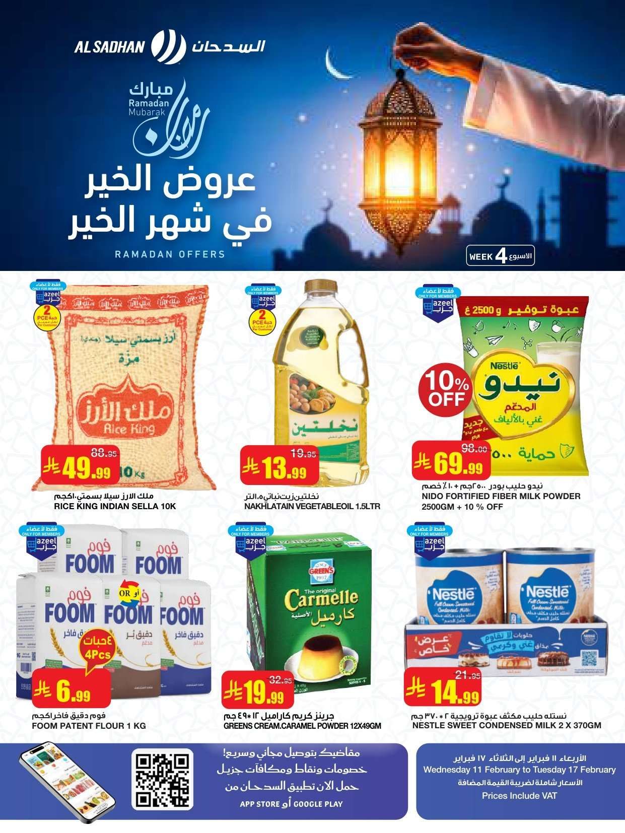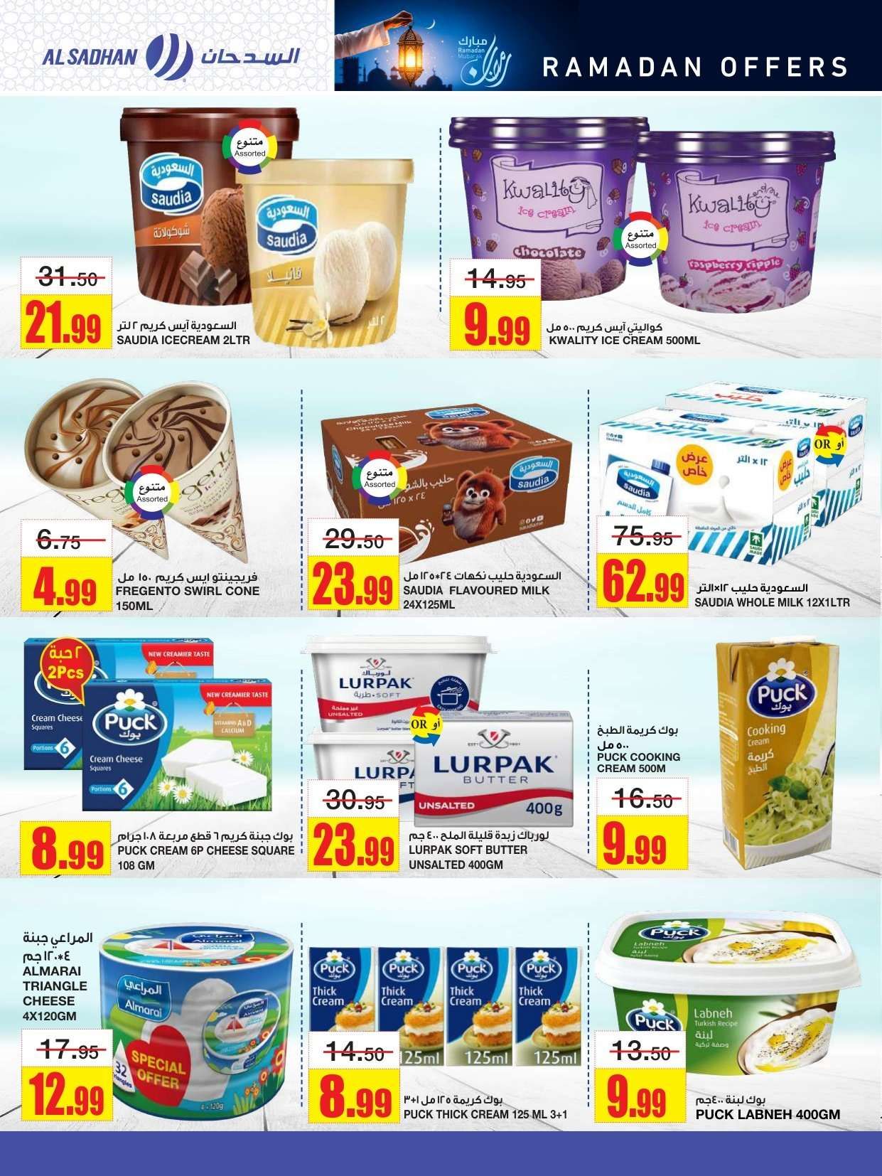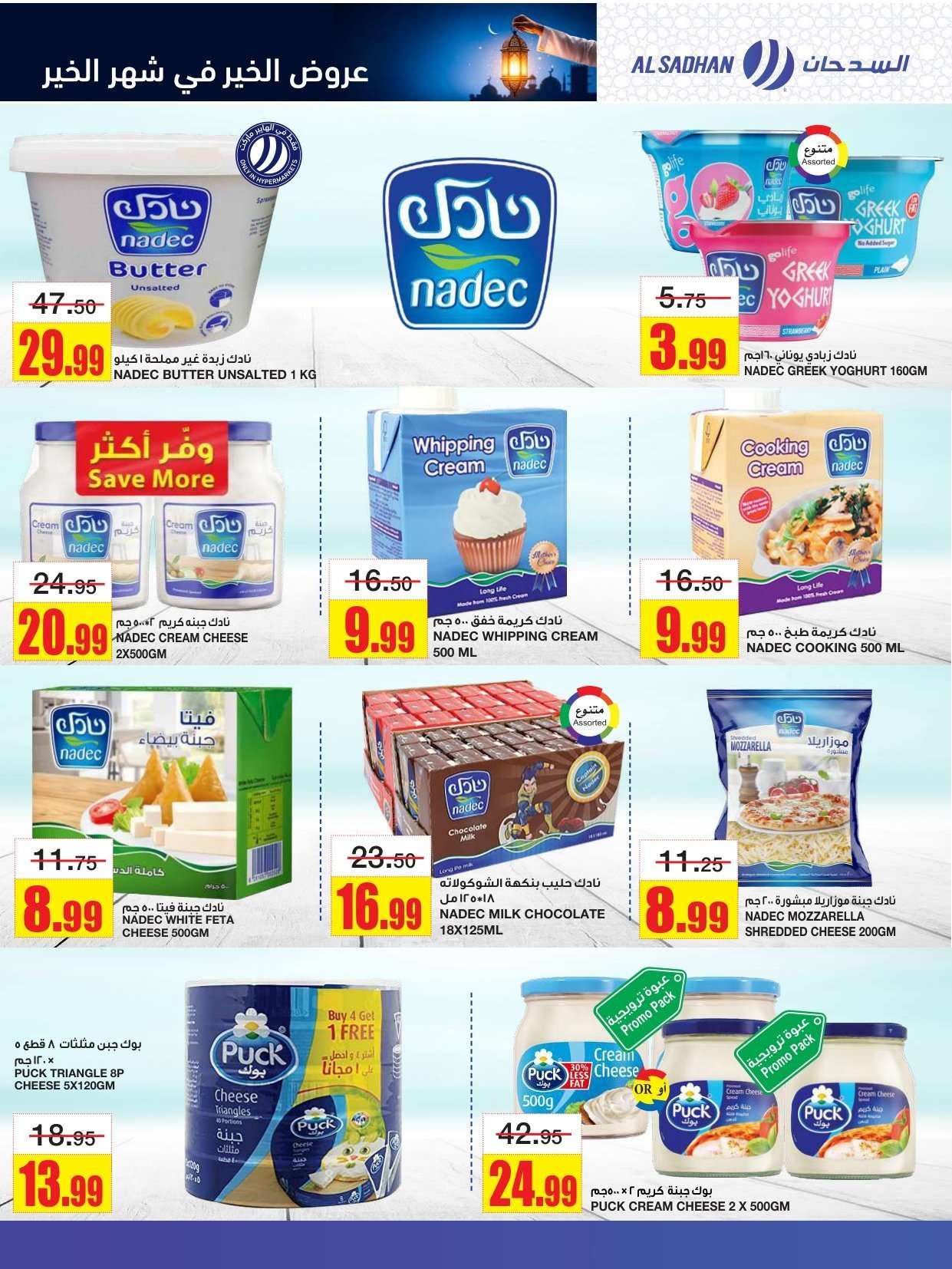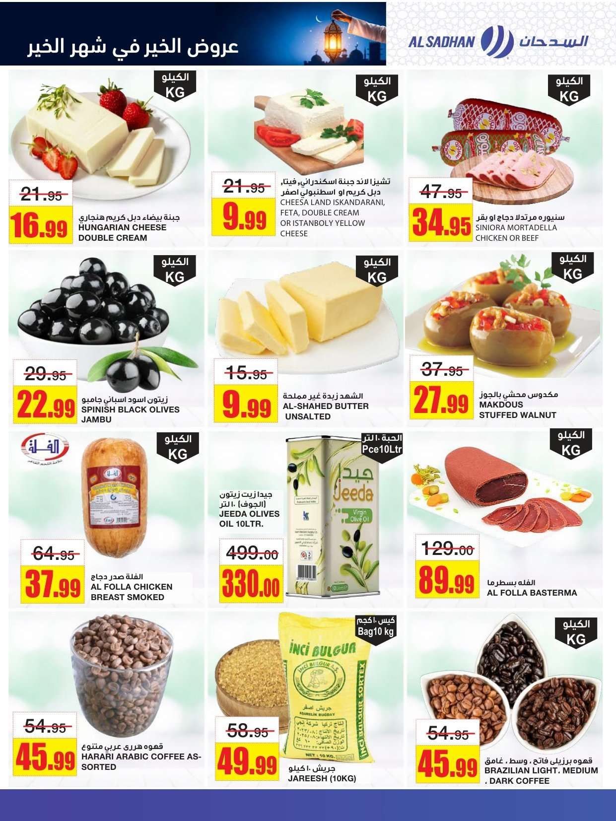 و توفير تخفيضات السدحان في شهر الخير و تشمل لحم العجل وسمك الهامور وجبنة الموزاريلا والقهوة واللبنة وشرائح الخيار والشمام والدجاج المبرد وأرز بسمتي والسكر والدقيق والعدس.