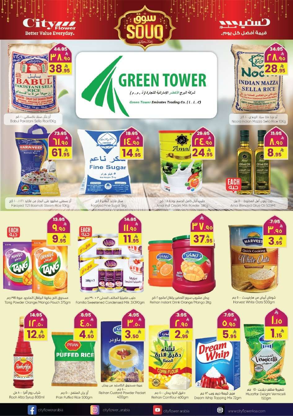 و تشمل ايضا سيتي فلور الرياض علي تشكيلة من المنتجات الغذائية منها اللحم البقري المفروم عصائر بسكويت الشاي الجبن الأبيض الأرز الهندي السكر الدقيق القهوة التمور الصلصات الدجاج والعدس