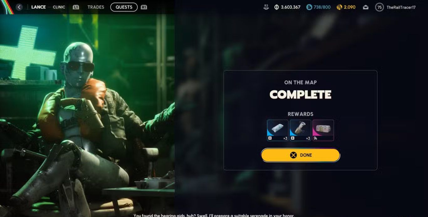 عند التفاعل مع Lance بعد إتمام جميع الأهداف المطلوبة يقوم بتأكيد نجاح المهمة بالكامل ويعترف بإكمال جميع خطوات triangulating والتنقل داخل المواقع المحددة مما يؤدي إلى فتح شاشة المكافآت وتسليم العناصر المستحقة للاعب.