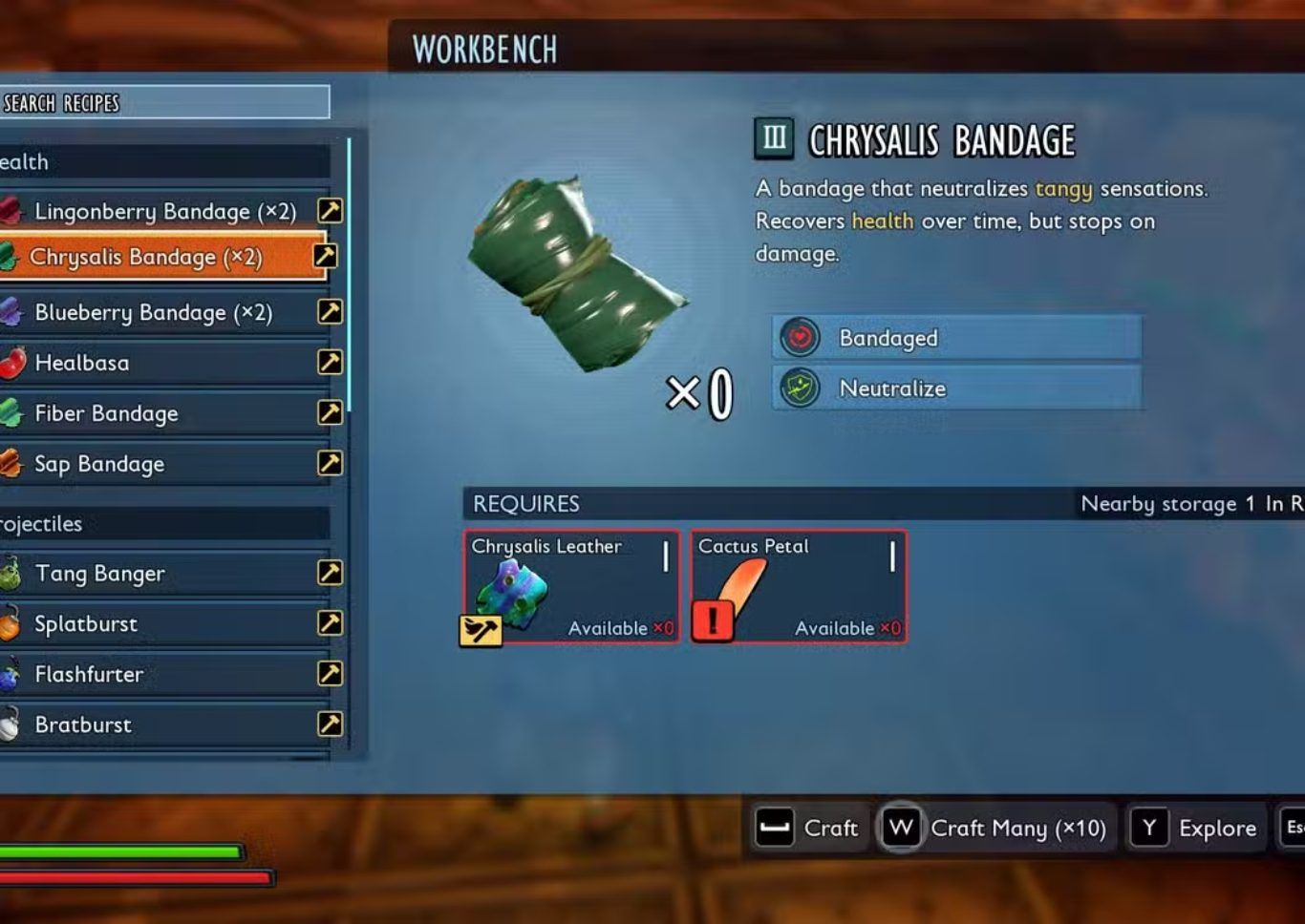 يتم تصنيع Chrysalys Bandage باستخدام مكونين رئيسيين هما Chrysalys leather و Cactus Petal حيث يتطلب ذلك من اللاعب استكشاف Garden Biome بعناية وجمع هذه الموارد مسبقا قبل التوجه إلى المناطق التي يكثر فيها Sour Tang Corrosion.