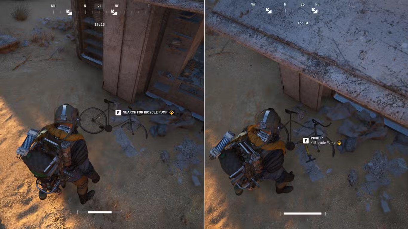 عند الاقتراب من الدراجة المتعطلة والتفاعل معها يظهر خيار يسمح بجمع Bicycle Pump بشكل فوري دون الحاجة إلى تنفيذ مهام إضافية أو مواجهة أي أعداء مما يجعل هذه الخطوة سريعة وآمنة نسبيا.
