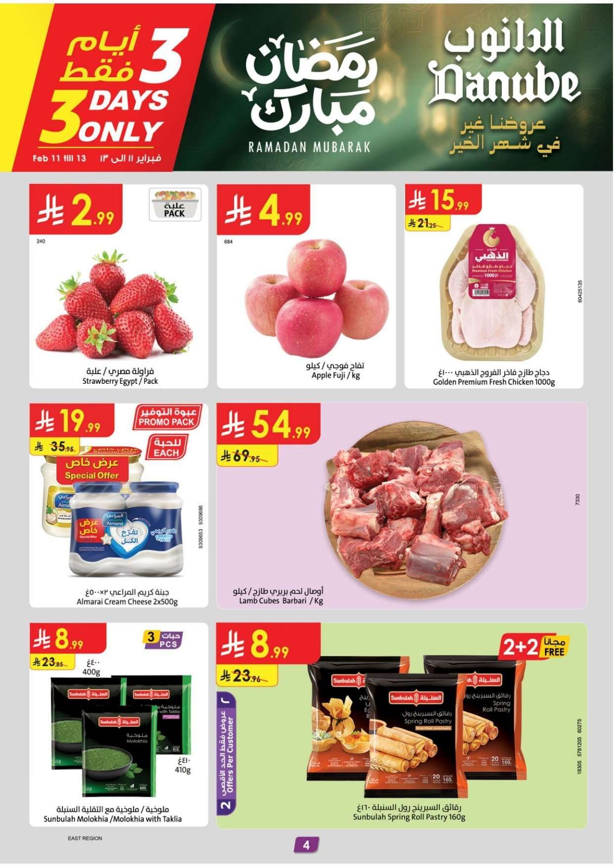 عروض الدانوب المنطقة الشرقية الخميس 12-02-2026 الموافق 24 شعبان 1447هـ و تتضمن الربيان الصغير واللحم النعيمي المبرد وأرز المزة والذرة المعلبة وفطر المشروم وصلصة الطماطم والخبز البر والمانجو الهندي