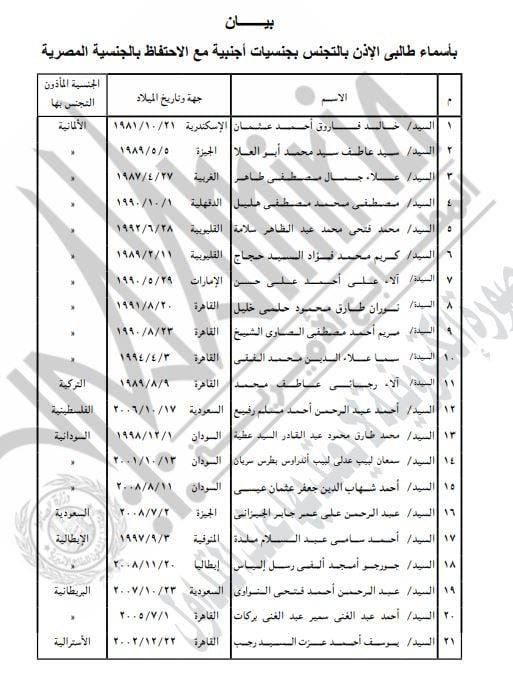 الخميس، 12 فبراير 2026 10:08 صنشرت الجريدة الرسمية، قرار وزير الداخلية رقم 135 و 136 لسنة 2026، بشأن منج الجنسية الاجنبية لـ 42 مصريا مع احتفاظهم بالجنسية المصرية، وذلك استنادًا إلى القانون رقم 26 لسنة 1975.