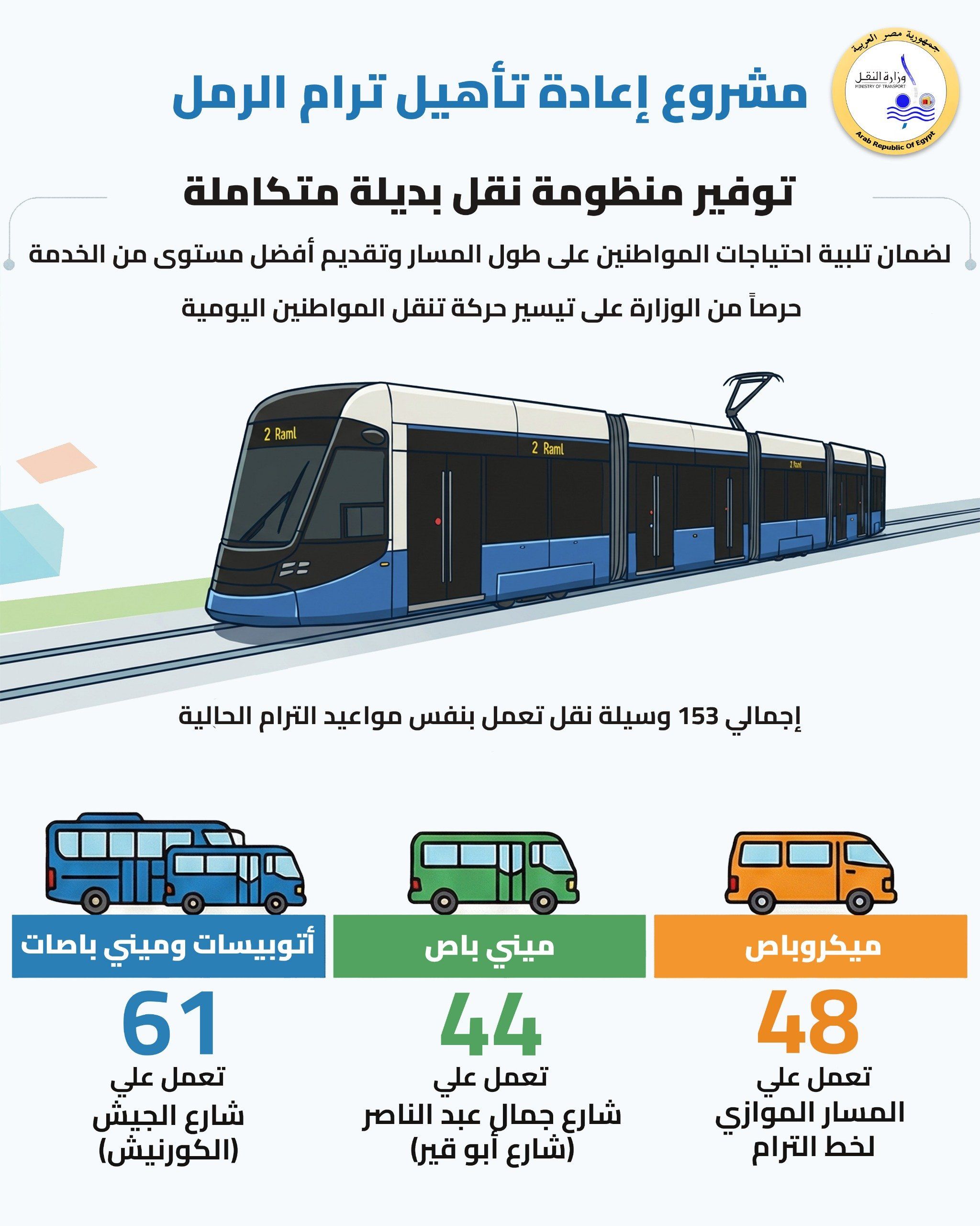 بدائل ذكية.. 153 وسيلة نقل لخدمة الركاب أثناء التنفيذ حرصاً من الوزارة على تيسير حركة المواطنين وعدم تأثر انتقالاتهم اليومية، تم توفير منظومة نقل بديلة متكاملة تعمل بنفس مواعيد الترام الحالية، وتضم 153 وسيلة نقل موزعة كالتالي: