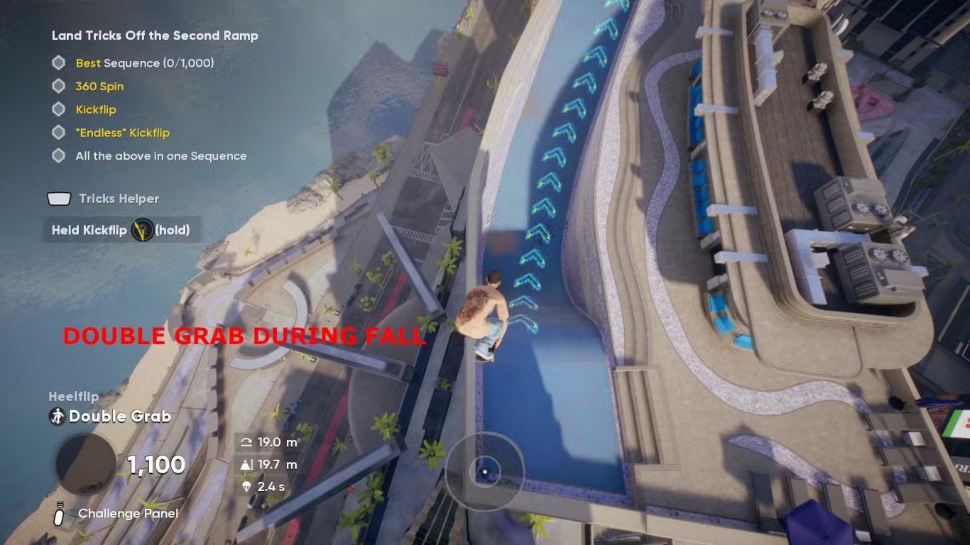 إذا كان اللاعب يلاحظ أنه يهبط قبل نقطة الهبوط المطلوبة، فيجب تقليل شدة حركة العصا اليسرى أثناء السير فوق المنحدر الأزرق. يؤدي الضغط القوي على العصا اليسرى إلى فقدان قدر كبير من الزخم، لذلك ينبغي استخدام لمسات خفيفة للغاية. كما يجب التأكد من تنفيذ Double Grab أثناء السقوط نحو المنحدر الأزرق، وبدء Kickflip في اللحظة الأخيرة الممكنة لزيادة المسافة.