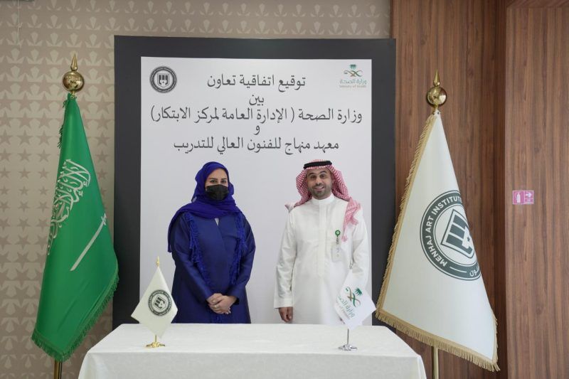 ومثل وزارة الصحة في توقيع الاتفاقية إبراهيم عسيري، نائب مدير مركز الابتكار بوزارة الصحة، بينما مثل المعهد هيفاء بنت منصور الجبيله، المدير العام لمعهد منهاج للفنون العالي للتدريب.